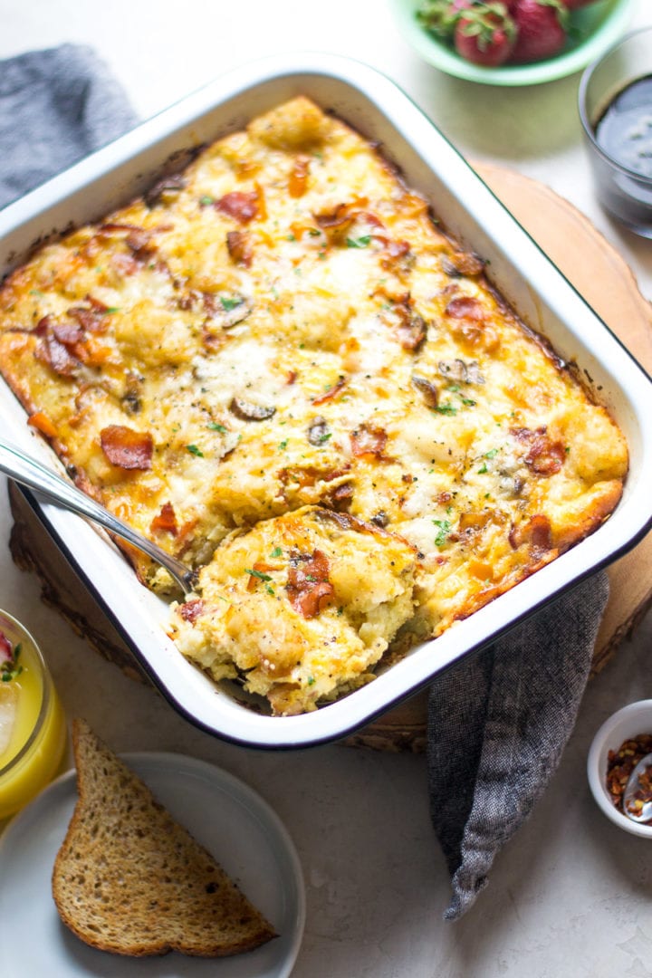 Bacon, egg, & cheese tater tot casserole is my favorite make ahead breakfast. Sautéed mushrooms, peppers, and onions mixed with eggs, cheese, crispy bacon, and toter tots then baked until golden.