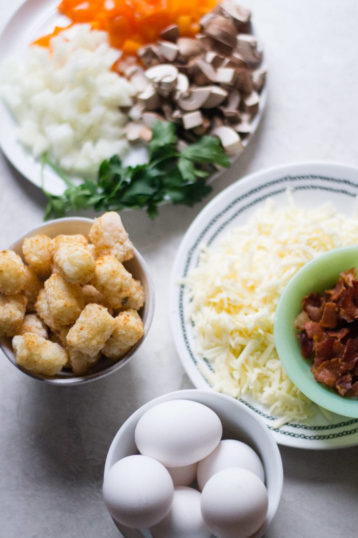 In addition to tots, the bacon, egg, & cheese tater tot casserole is filled with mushrooms, onions, and bell pepper.