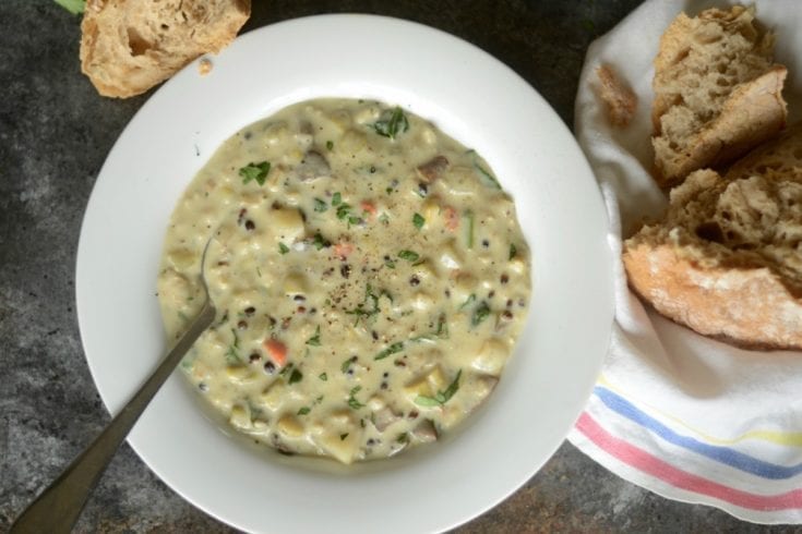 Creamy soup loaded with lots of mushrooms and potato, a hint of garlic and herbs, and cooked in 35 minutes.