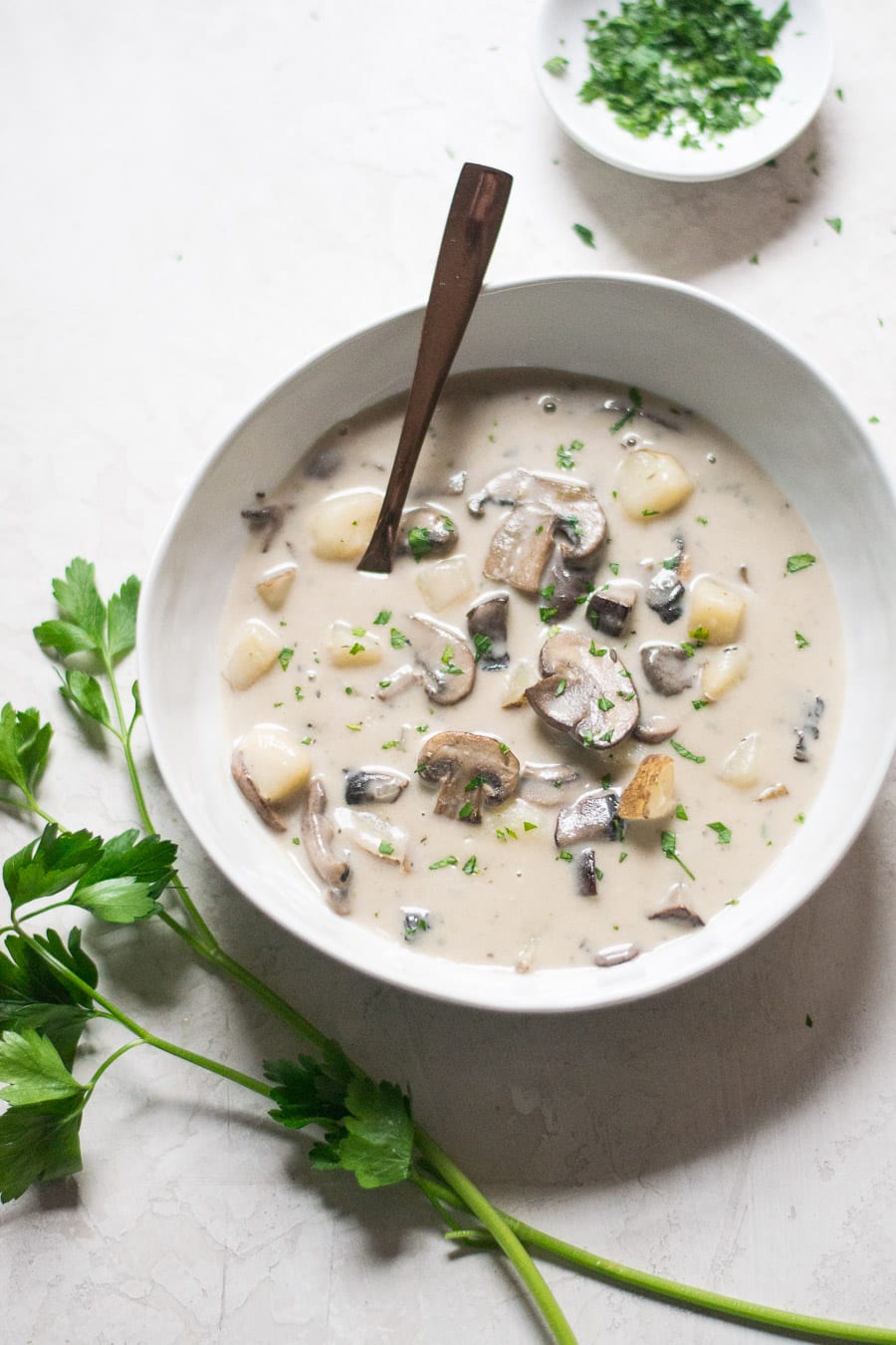 Cream-based soup filled with mushrooms, celery, carrots, spinach, fresh herbs, and gnocchi.