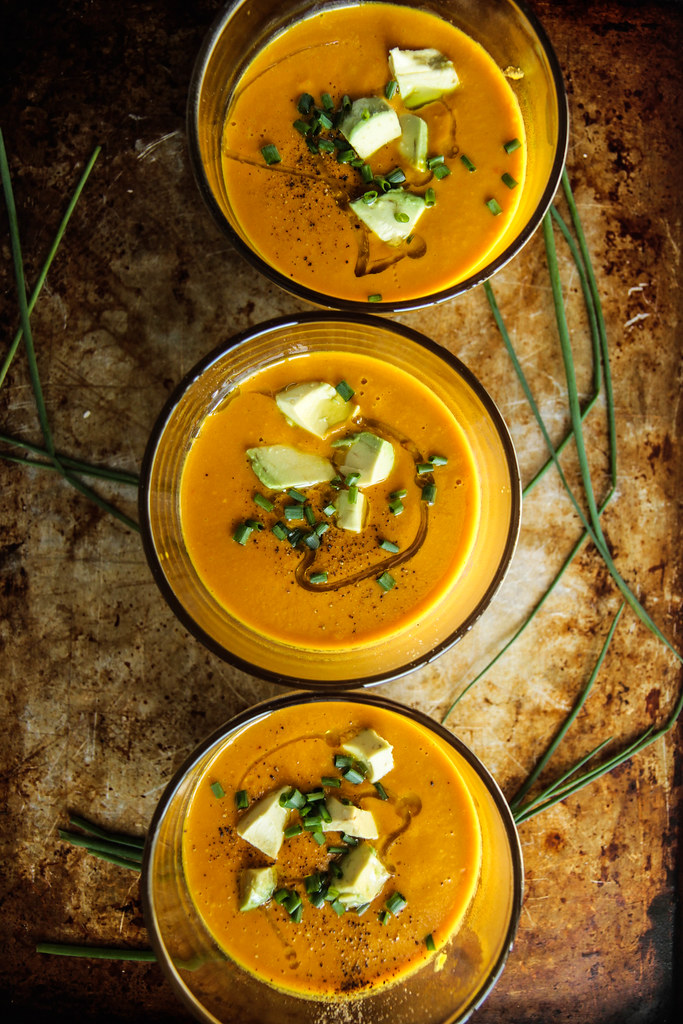 Roasted tomatoes, fennel, onions, and garlic purred until smooth make the perfect cozy, yet slightly sweet and spicy soup to transition into spring.