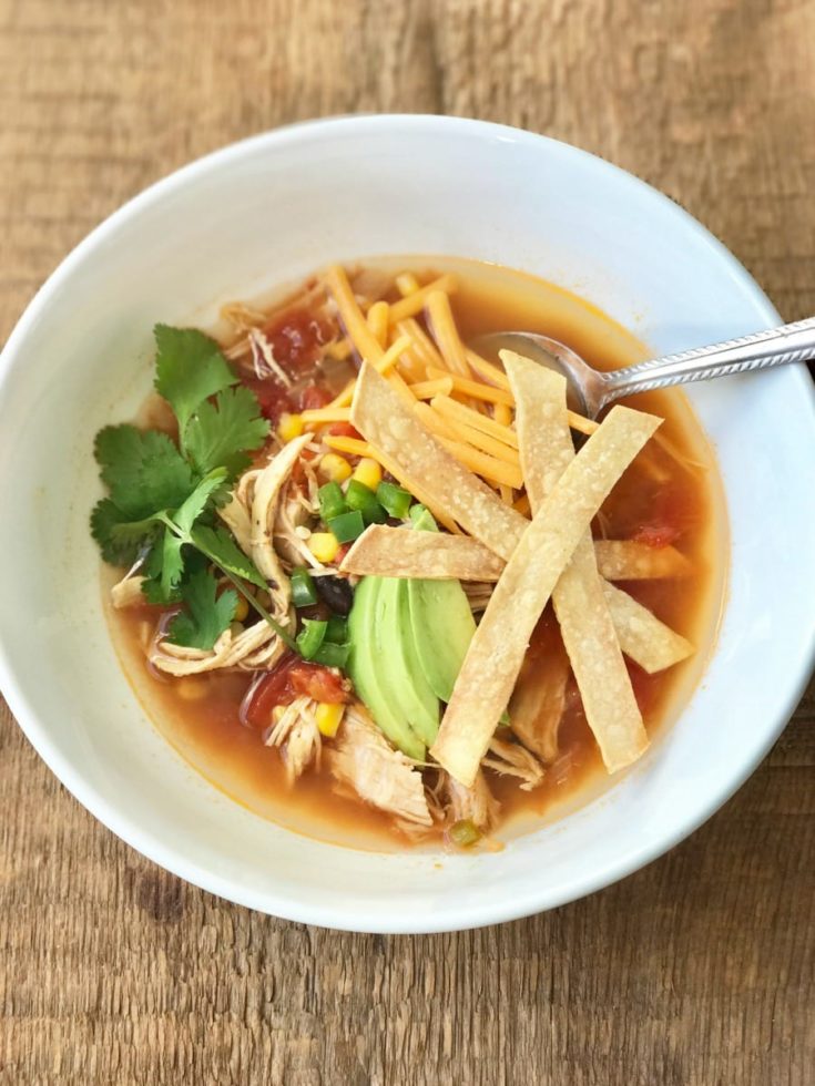 Lime flavored bright chicken tortilla soup with corn, black beans, lots of shredded chicken and fire roasted tomatoes gets an extra something with big pieces of avocado mixed in.