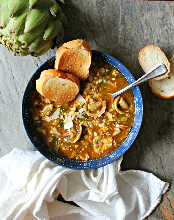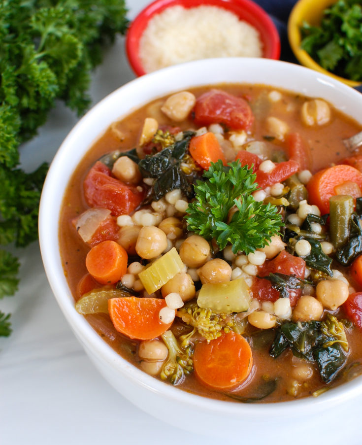 A hearty tomato-based soup loaded with carrots, celery, onion, white beans, kale, and lots of crusty bread. Think minestrone pot pie without the pie crust.