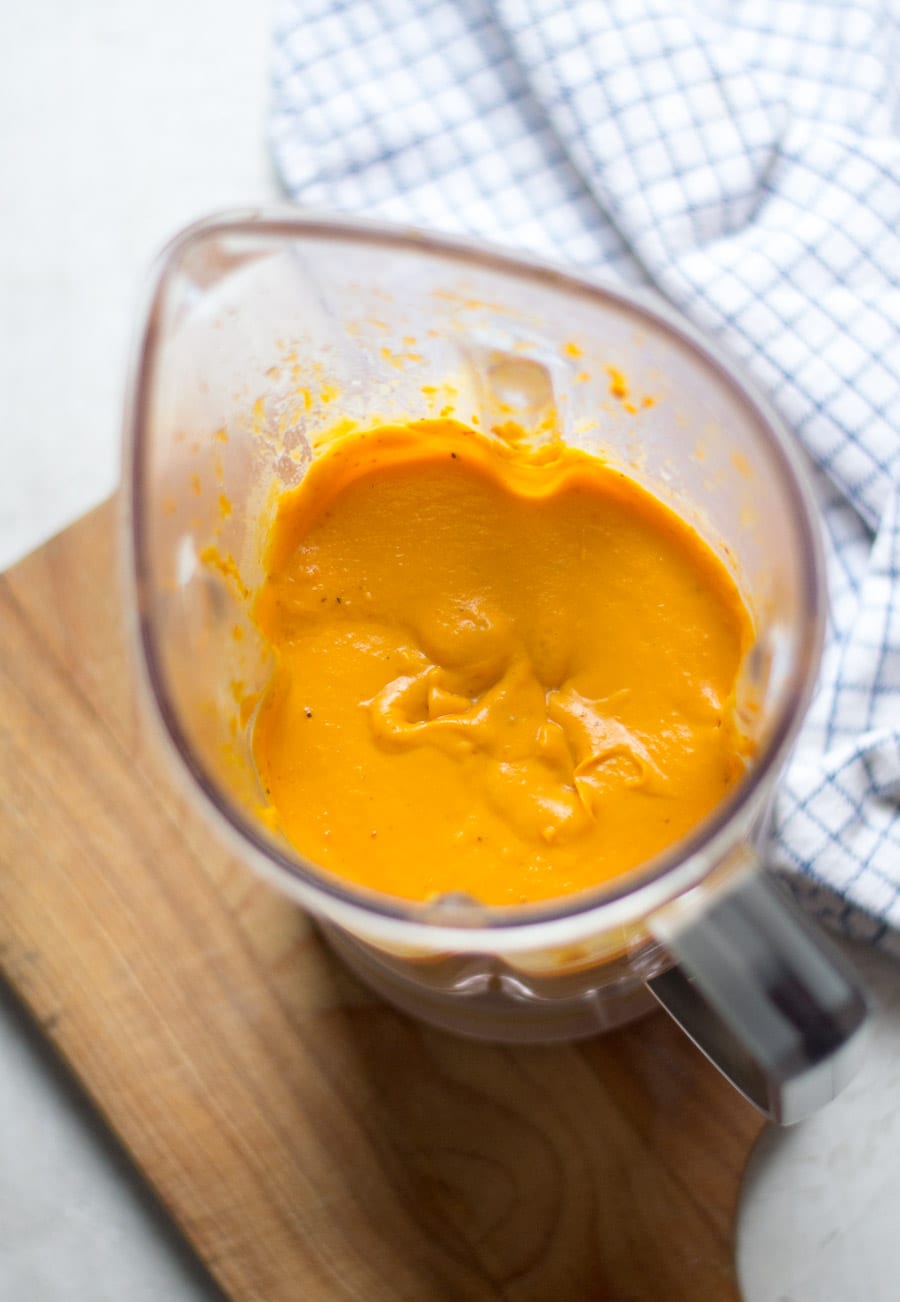 - Add the squash and about 3-5 roasted garlic cloves to a blender along with the stock, cream, chipotle peppers, and 1 tsp salt. Puree until smooth and creamy, scraping down the sides as needed.