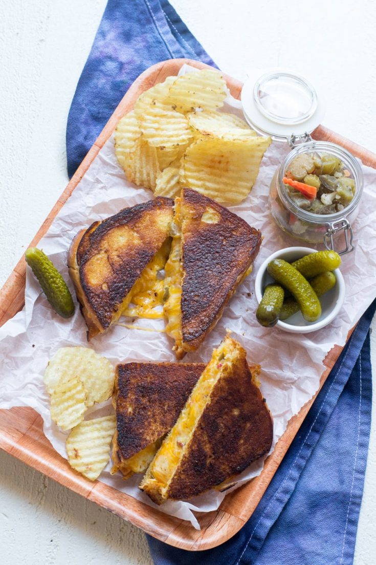 Or if you have an egg allergy or are truly averse to eggs, just butter the bread and pour about a tablespoon of the hot giardiniera oil to a skillet when you make the grilled cheese.