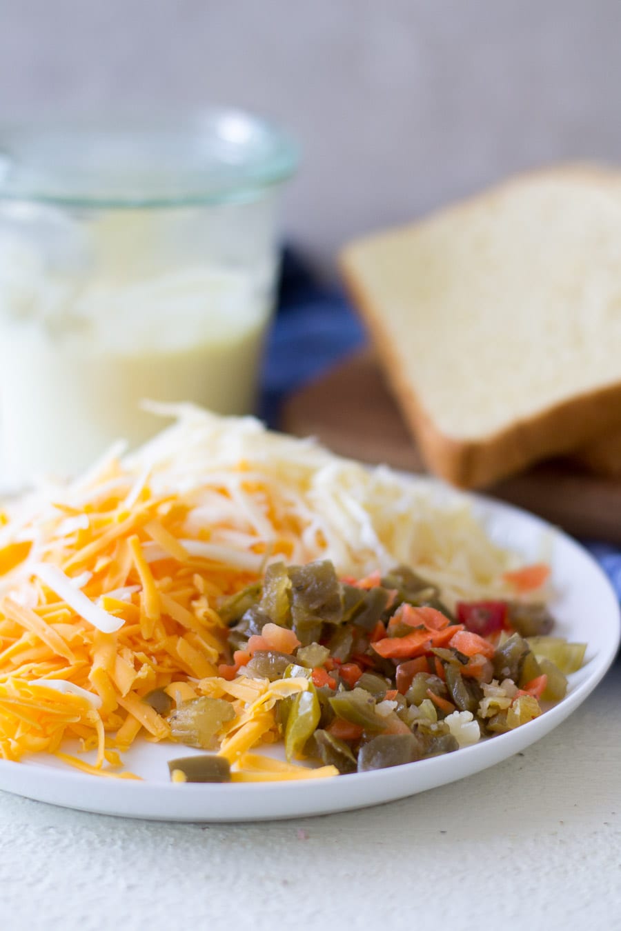 The filling of the grilled cheese is shredded sharp cheddar and a little mozzarella mixed with chopped up giardiniera.
