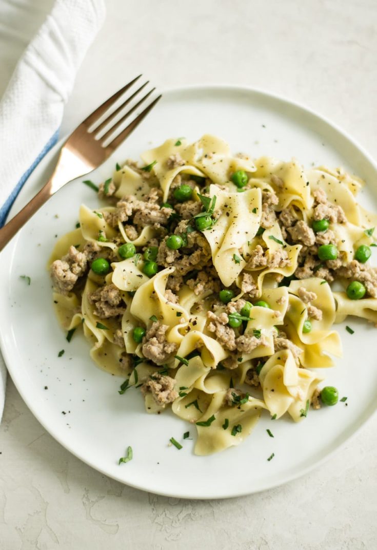 Light and creamy turkey burger version of the classic Hamburger Helper with peas mixed in for a pop of color and flavor!