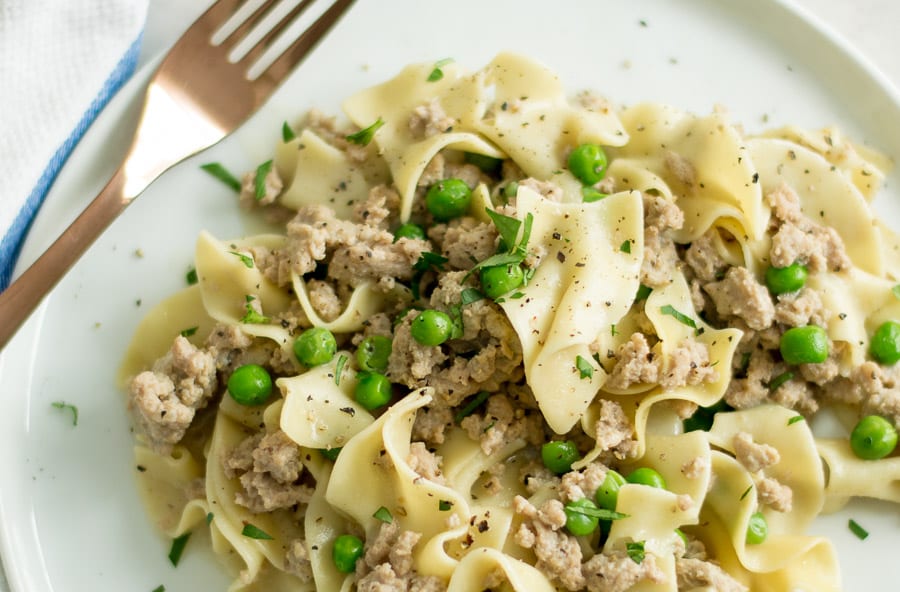Turkey burger helper with peas is made in under 25 minutes in the pressure cooker. It has all the comforts of the classic boxed hamburger helper except in less time and a bit healthier!