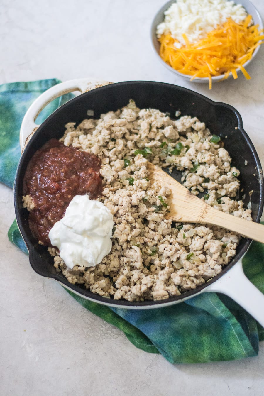 Add the ground turkey and seasonings. Use a wooden spatula to break the meat apart and evenly cook/brown for about 10 minutes. - Once the meat is cooked through, mix in the sour cream and salsa.