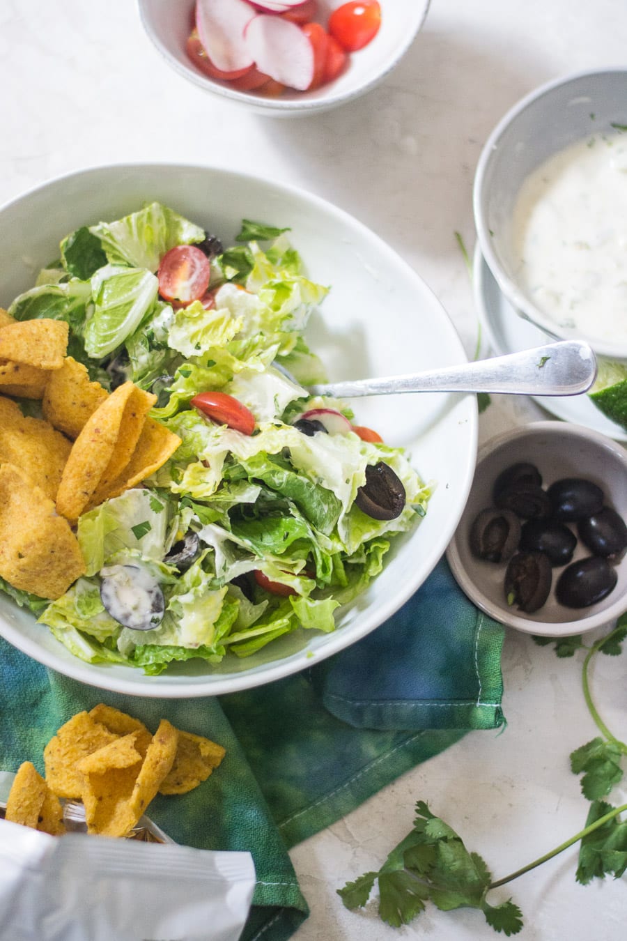 - Mix the ranch, lime juice, jalapeño, and cilantro in a small bowl. Add all the salad fixings to a medium mixing bowl. Toss to combine. Add in about half the corn chips to the salad. Use about 1/2 the dressing. Toss to mix it all together.