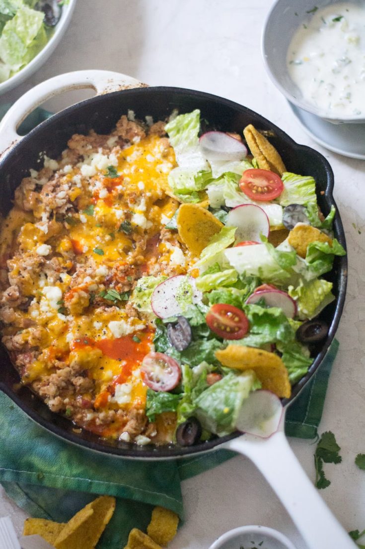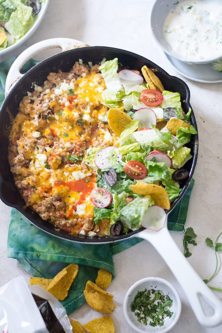 Skillet walking taco bake is made from lean ground turkey, onion, jalapeño, salsa, sour cream, and cheese. It is baked until melted and then topped with a spicy ranch salad and lots of corn chips! It is like a traditional walking taco all in one skillet!