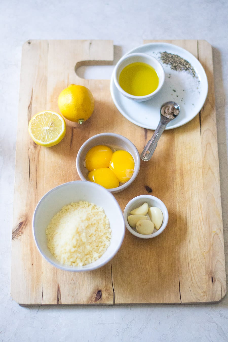 Think of this recipe of a mash up between a Caesar salad (minus the lettuce) and Spaghetti Carbonara.