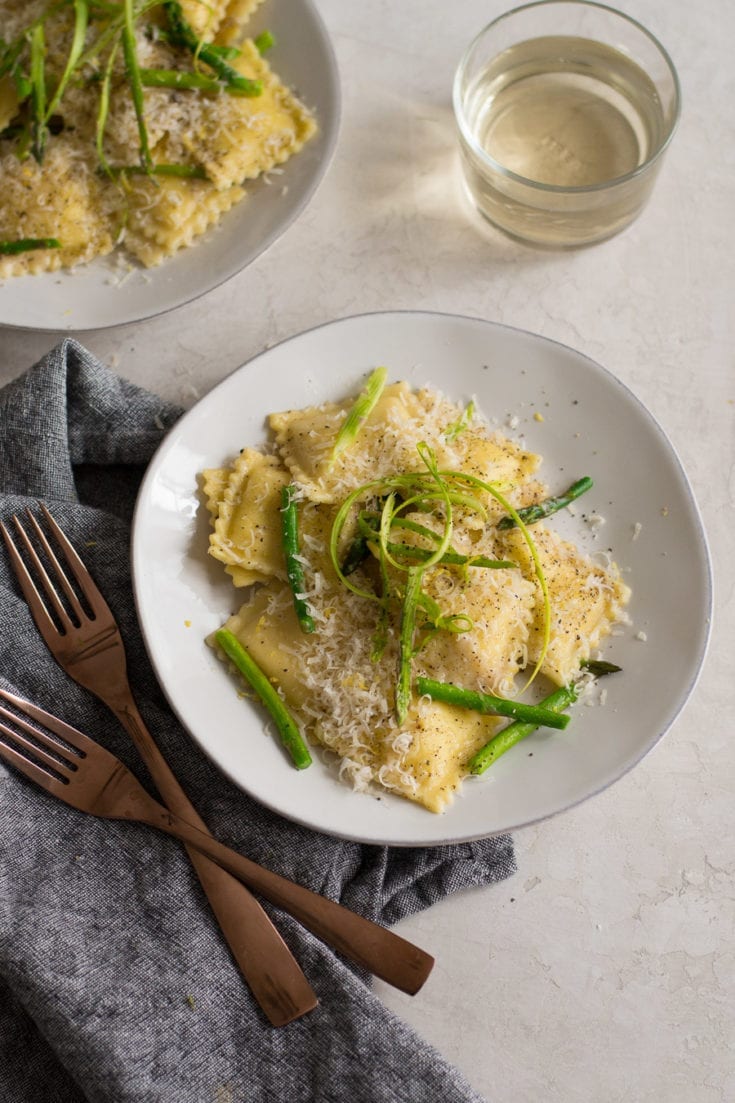 Cheese filled ravioli tossed with butter, parmesan cheese, lots of black pepper, fresh asparagus, and a little bit of lemon to finish it off.