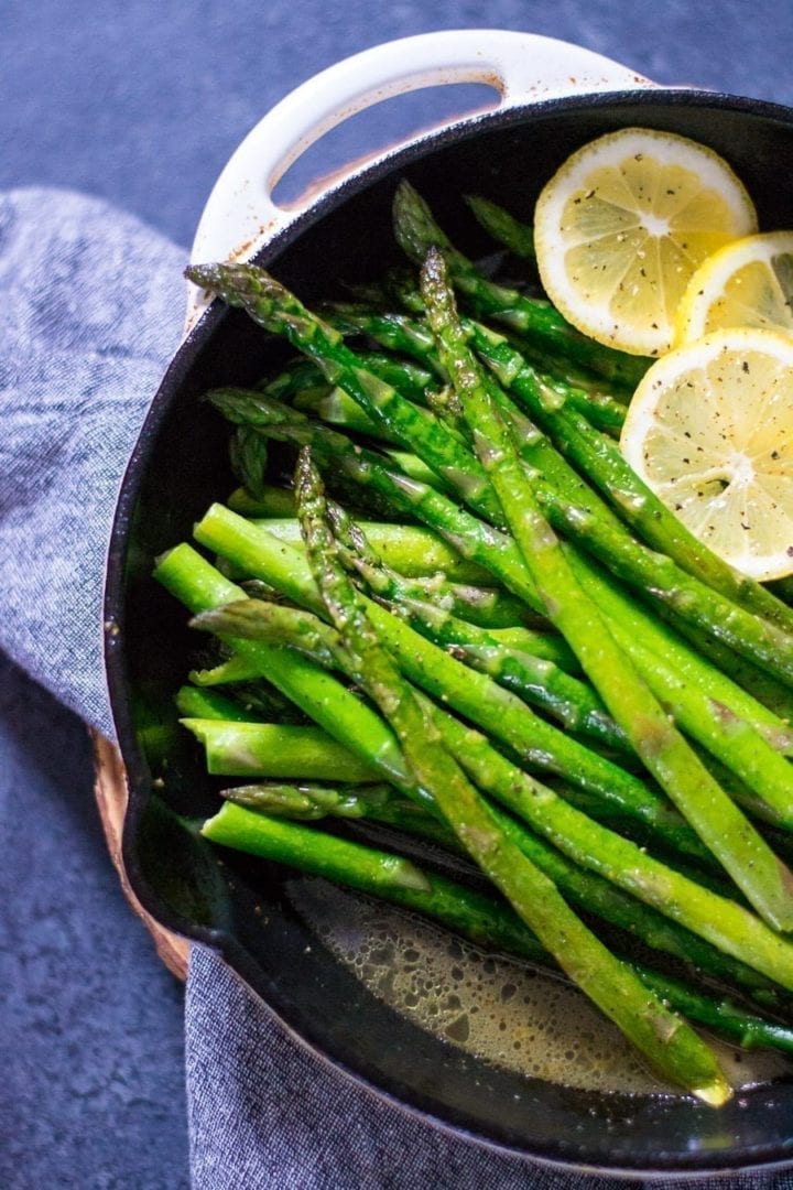 Simply cooked skillet asparagus in a brown butter and lemon sauce.