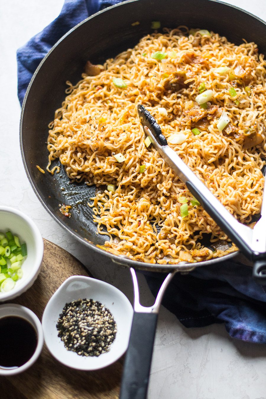 Two packets of cooked ramen noodles sautéed in a sauce of brown butter, soy sauce, and chopped kimchi.