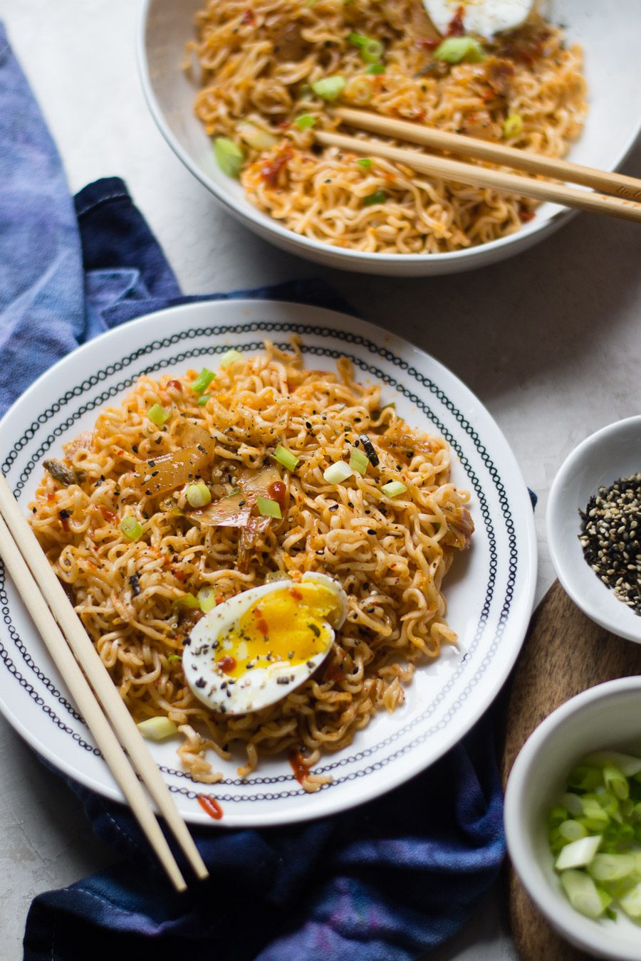 - Plate up the noodles and top with remaining green onions. Top with egg, sriracha, or furikake if you are using them.