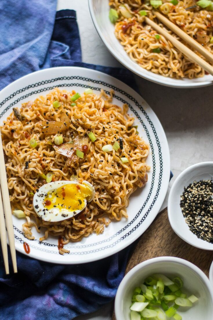 Brown butter and kimchi ramen stir fry is the easiest, slightly spicy meal to throw together in a snap. Browned butter, soy sauce, and kimchi mix together to make a great sauce for a packet of cooked ramen noodles.