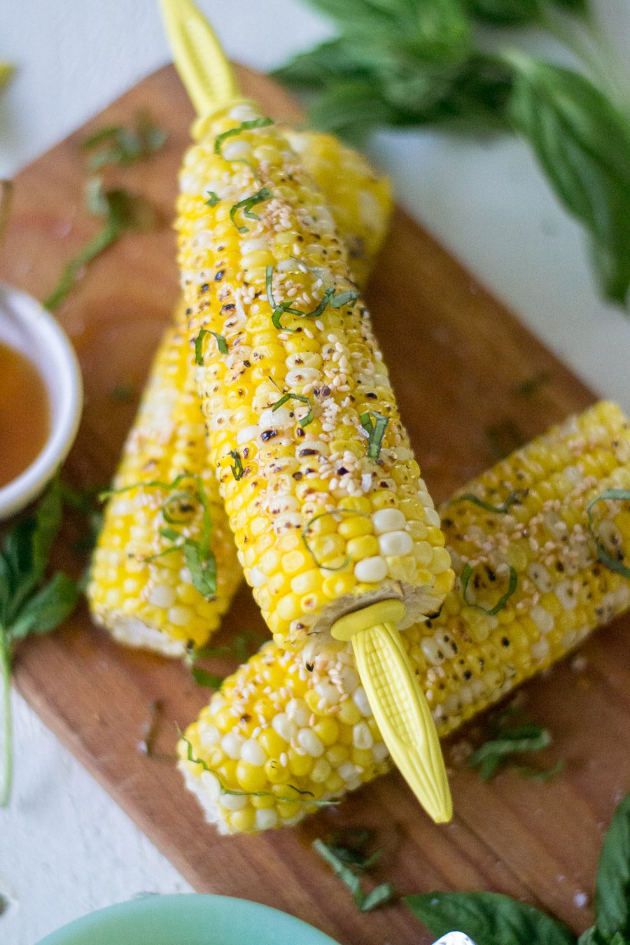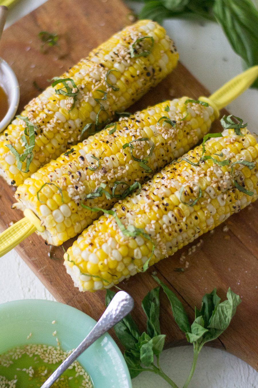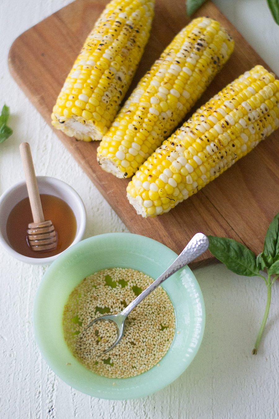 - Drizzle the sesame seeds and oil, using a spoon, over each ear of corn. Top with generous drizzles of the hot honey. Sprinkle basil and salt on top. serve warm