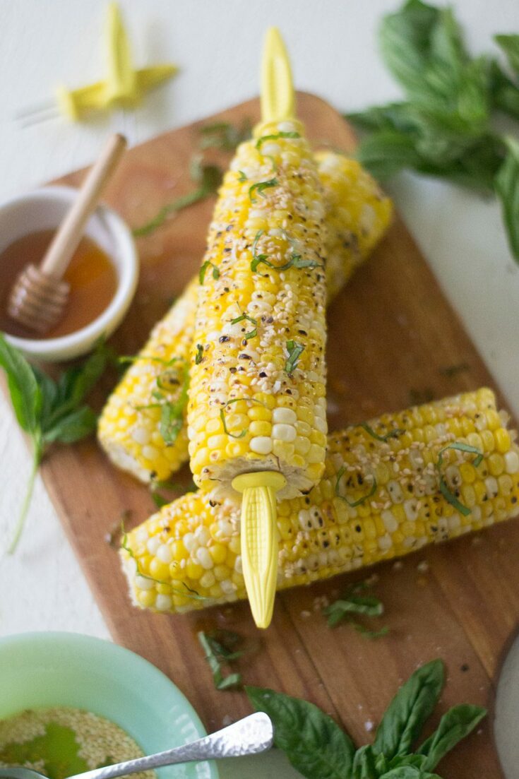 Toasted sesame and hot honey corn on the cob is delightfully nutty, sweet, and spicy. This different twist on grilled corn combines toasted sesame seeds, olive oil, hot honey, and basil.