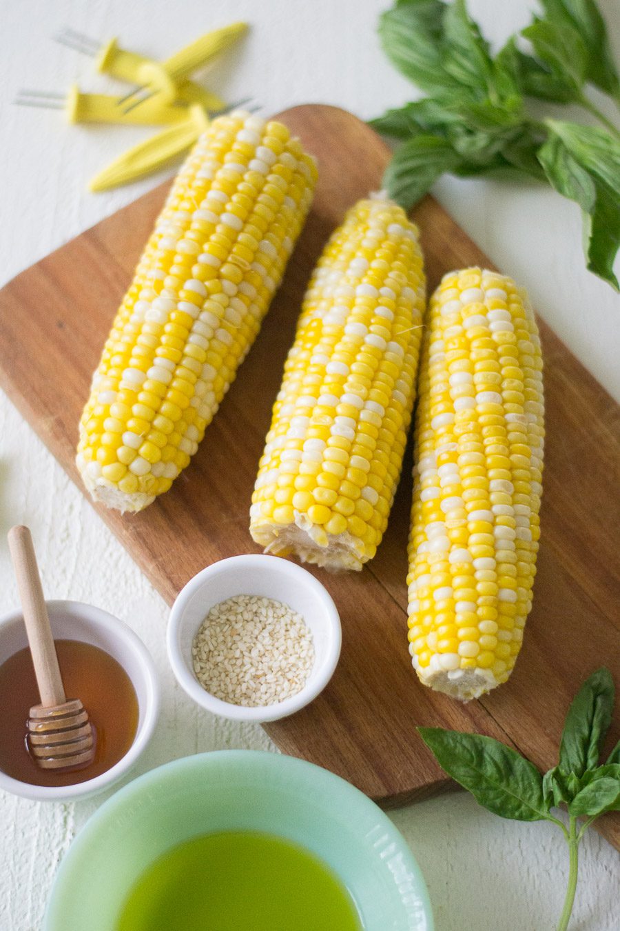 Cut the corn off the cob and toss it together with the hot honey, sesame seeds oil, fresh basil, and salt.