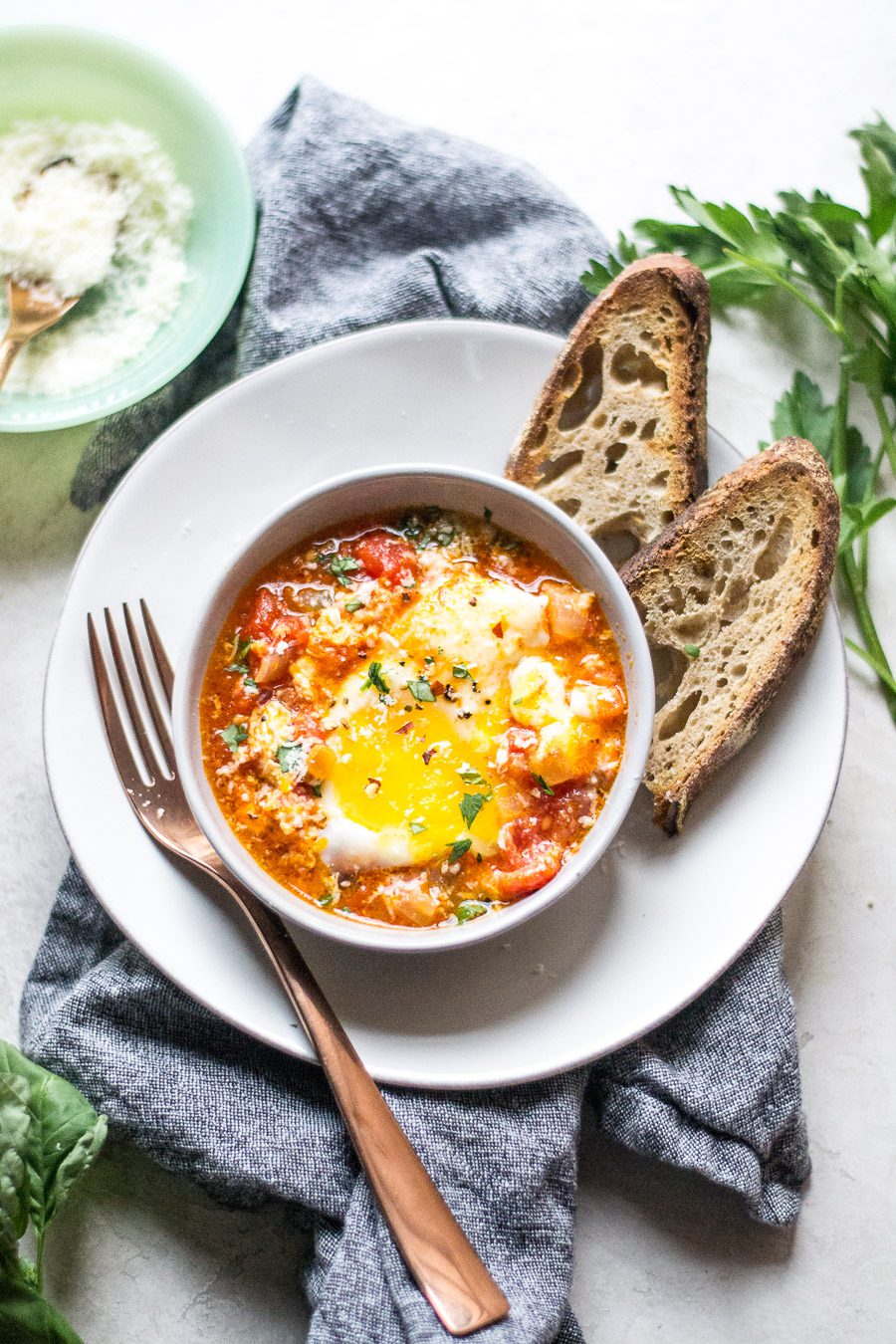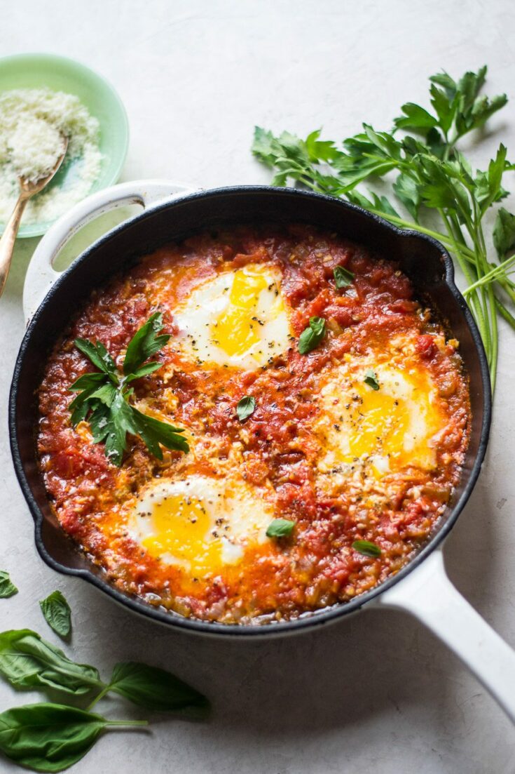 Eggs cooked in a fresh tomato sauce with onions, garlic, crushed red pepper flakes, and olive oil.