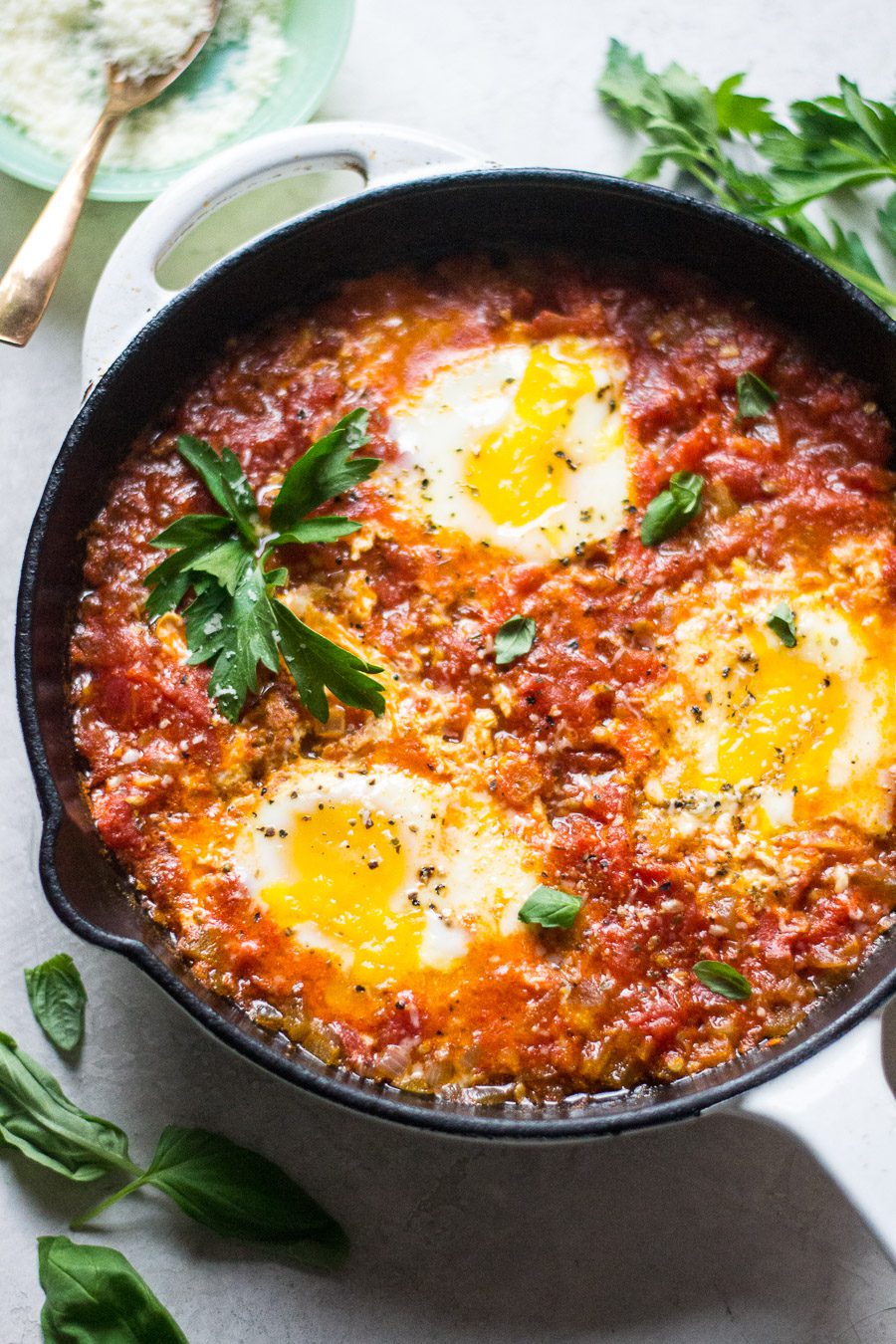 - Once the tomatoes are all crushed and mashed, make three or four small wells in the tomatoes. Crack an egg into each well. Cover the skillet with a lid, reduce the heat to medium/low. Cook eggs until they are set, about 10-15 minutes.