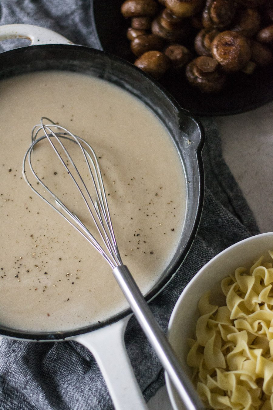- Add flour and whisk to combine with the butter and mushroom sauce. Slowly whisk in the stock once the roux is formed. Keep whisking until fully combined and no lumps remain.