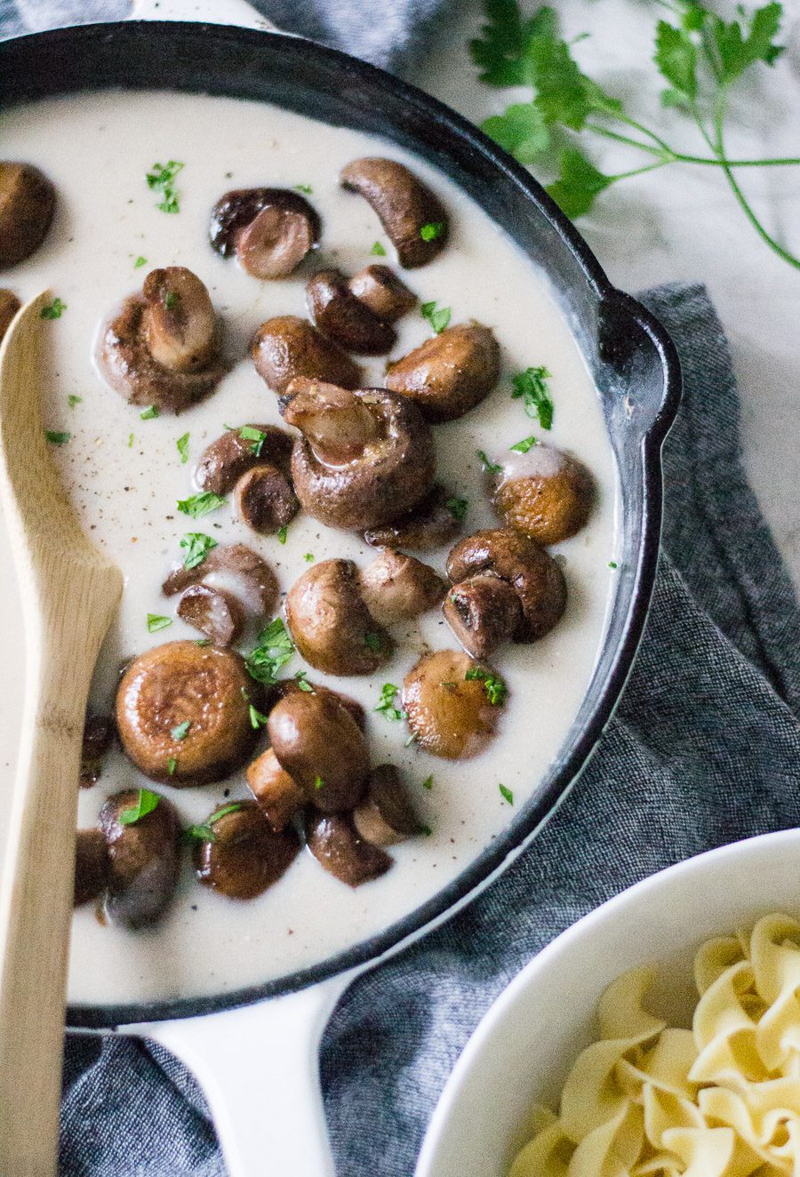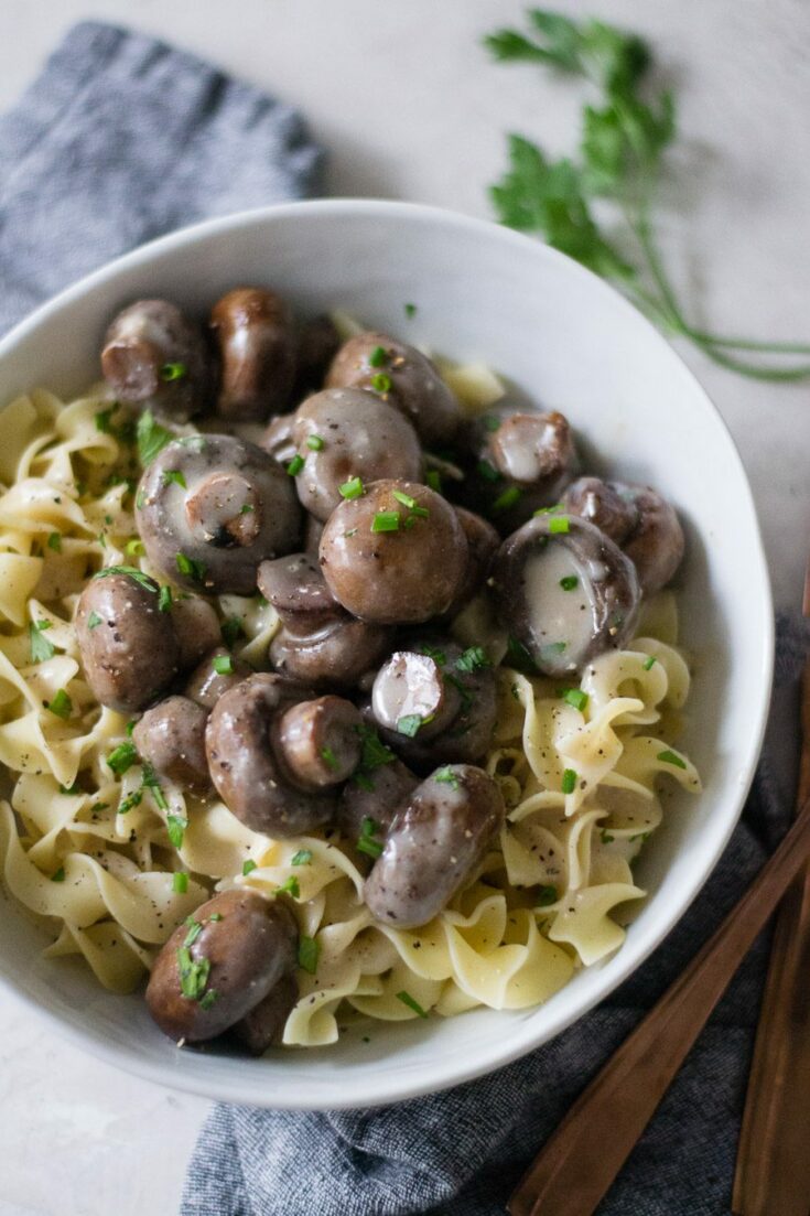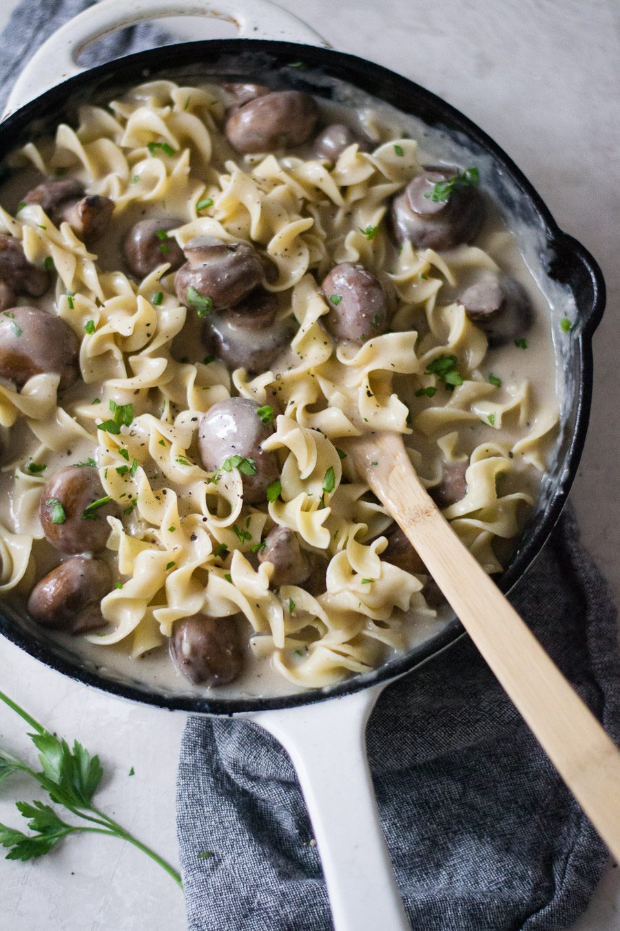 Caramelized Mushrooms served in a creamy, Swedish Meatball style sauce served over egg noodles.