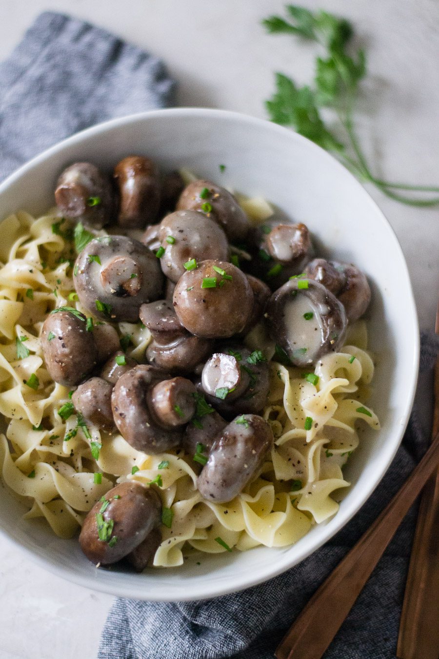 - Serve the mushrooms and sauce over cooked egg noodles, rice, or mashed potatoes. Top with chopped chives and parsley.