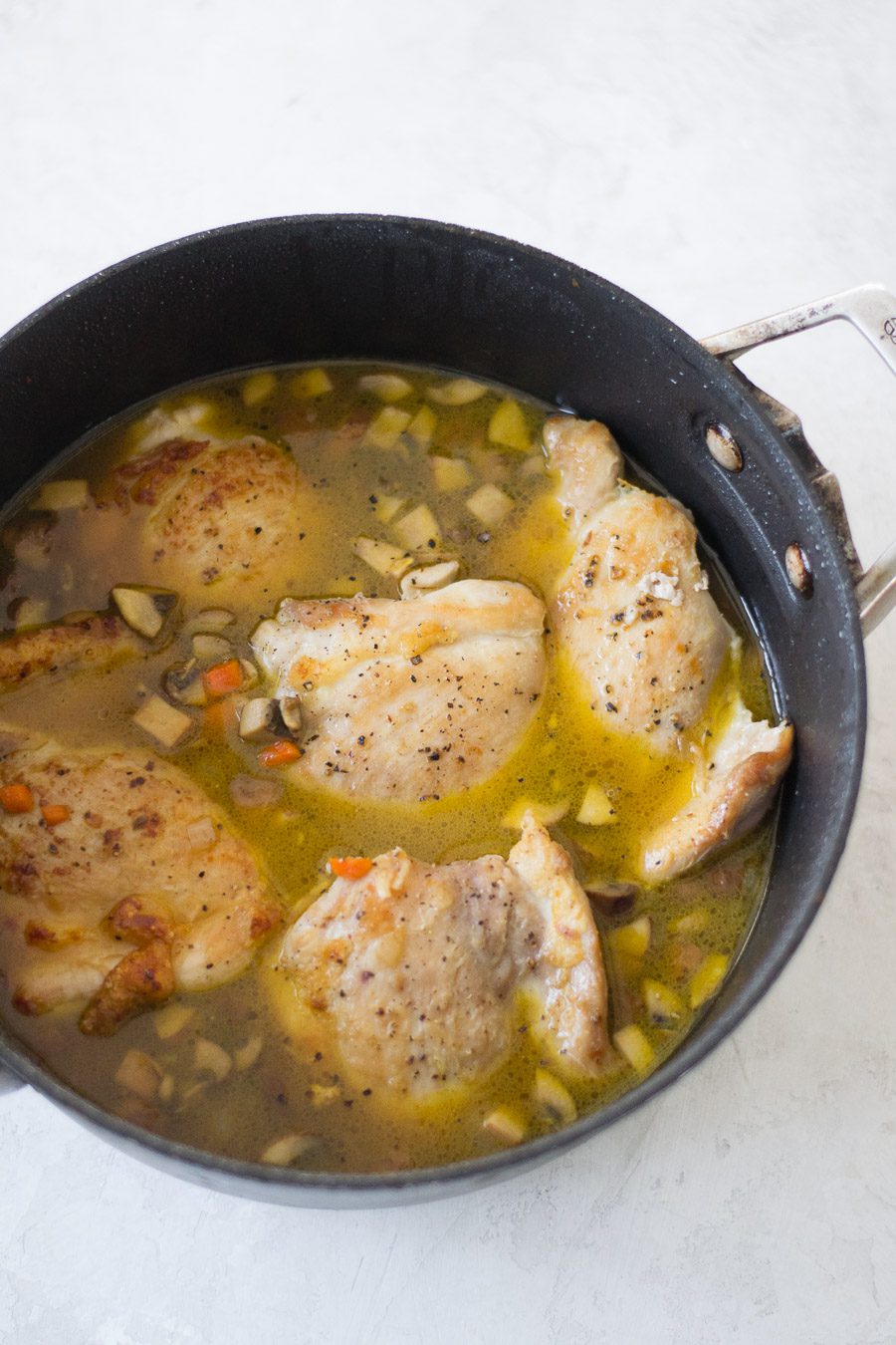 Add in the mushrooms, carrots, and onion after the chicken is browned.