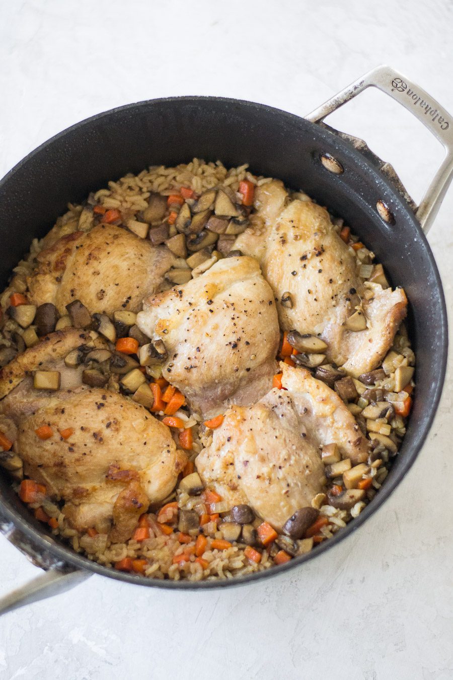 One pot meal with a French Onion seasoned rice filled with mushrooms, carrots, and onions cooked alongside tender and juicy chicken thighs.