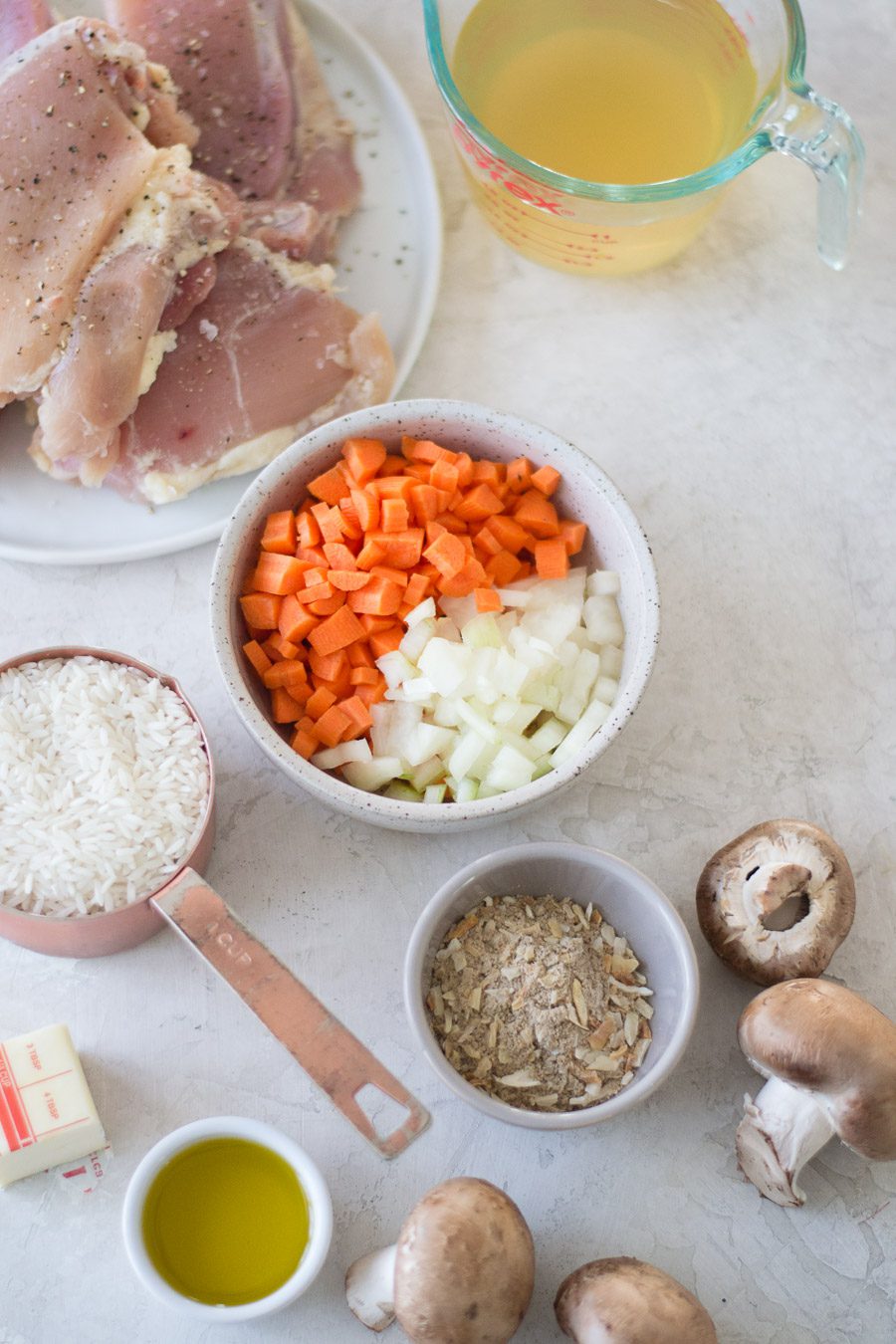 One Pot French onion chicken and rice is the perfect minimalist meal packed with lots of flavor. Chicken thighs, mushrooms, onion, carrots, rice and a packet of French onion soup/dip mix make for one epic meal.