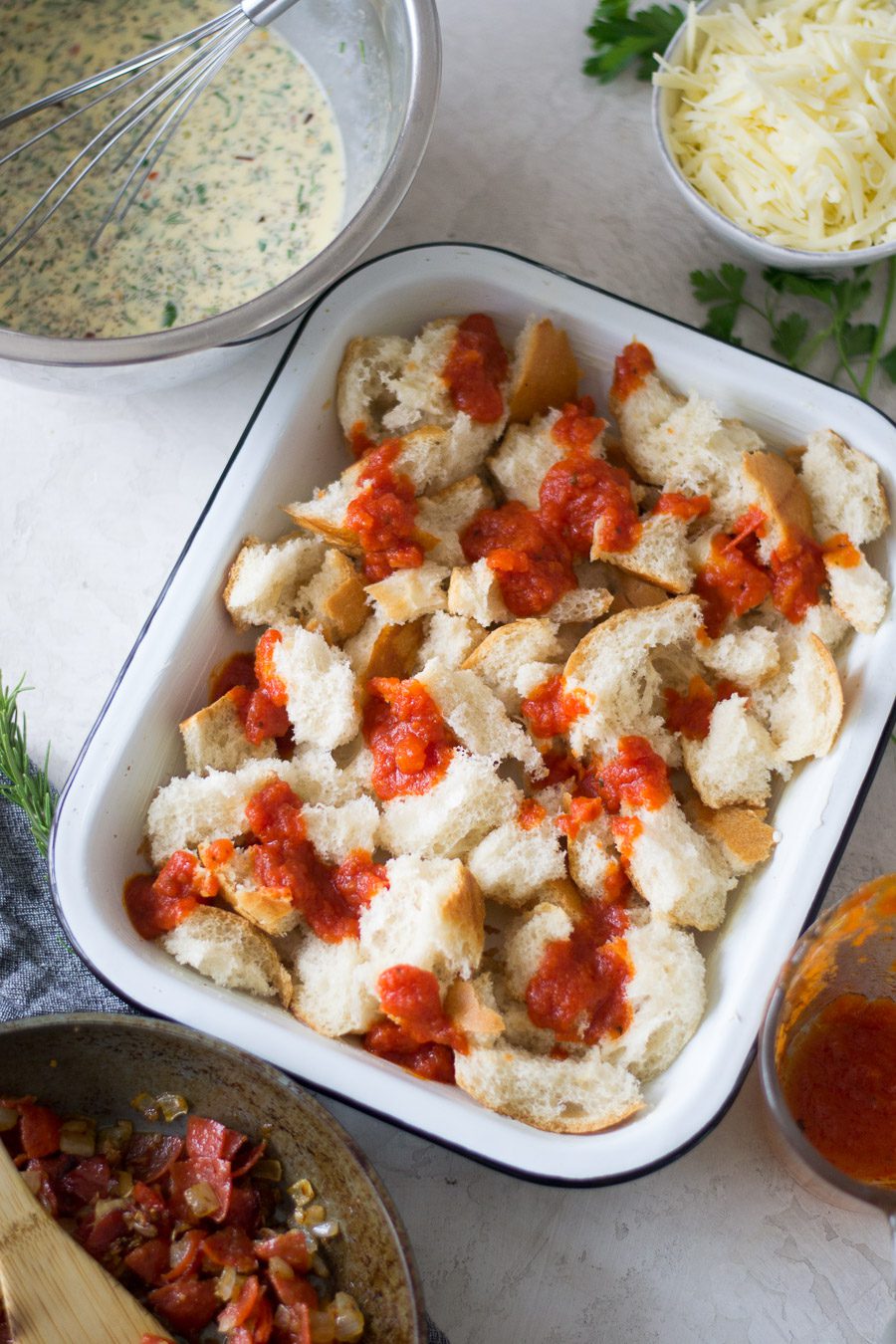 - Add all of the pepperoni, garlic, and onion EXCEPT for 1 heaping TBSP to the bread. Toss gently to mix and combine. Make sure that all the pepperoni does not go tot he bottom. Use a teaspoon to dot the marinara over the top of the bread and pepperoni. Pour the egg mixture over the bread and pepperoni.