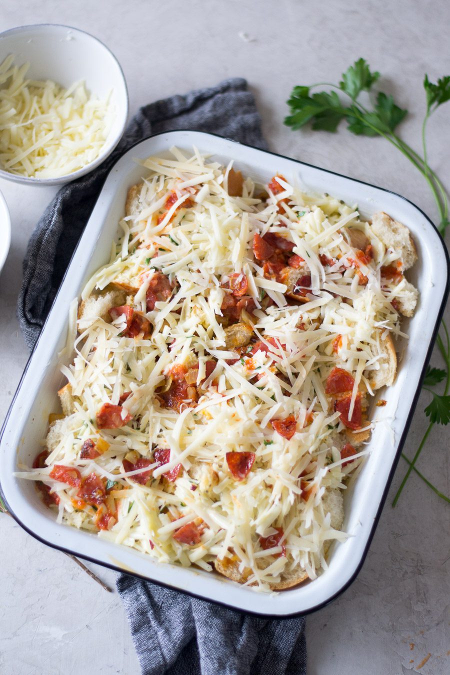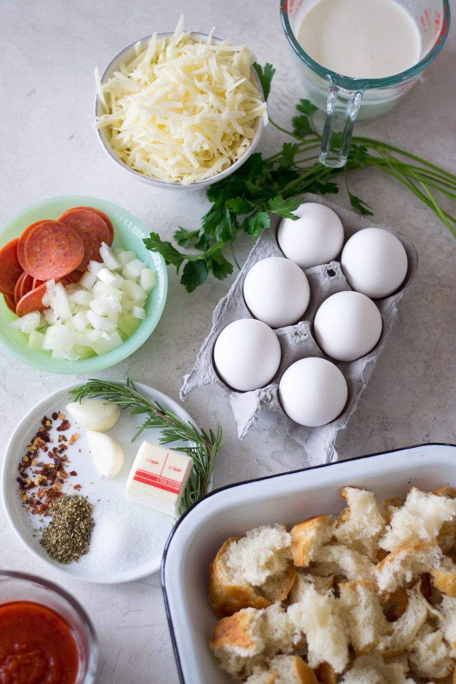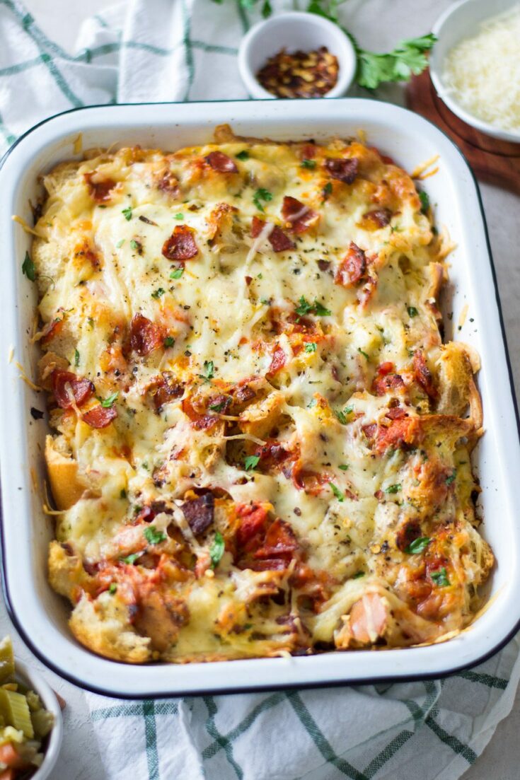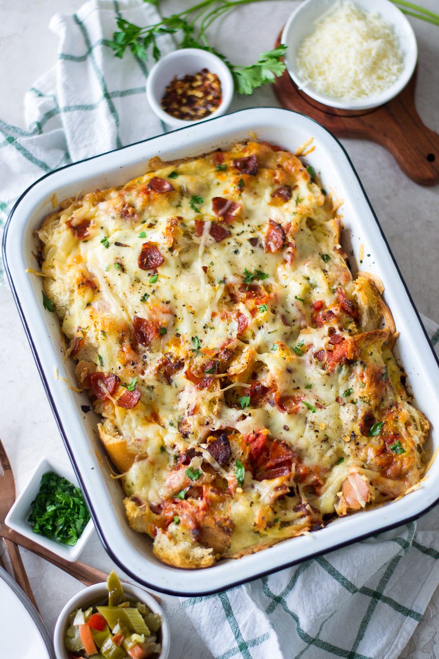 A creamy and fluffy egg and baguette based strata layered with lots of mozzarella, crispy pepperoni, garlic, onion, and marinara.