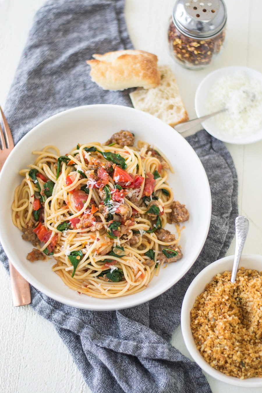 Rustic sausage and spinach spaghetti with crispy garlic herb breadcrumbs is an easy meal to feed a crowd. Mild Italian sausage with red bell pepper, onion, fire-roasted tomatoes, and fresh spinach make a lovely hearty meal. Top with the crispy garlic herb breadcrumbs for texture and another layer of flavor.