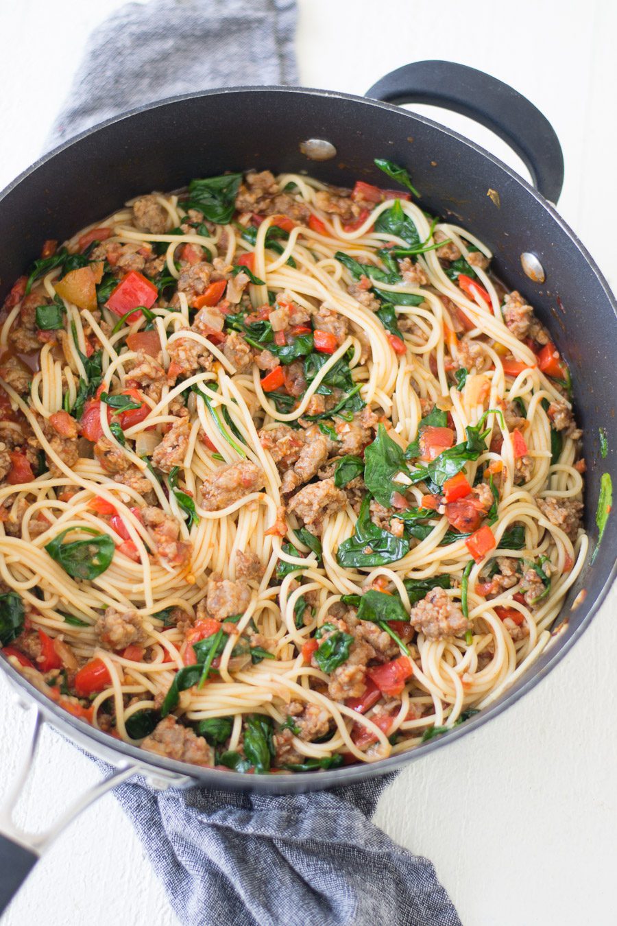 Rustic sausage and spinach spaghetti will make most of your family happy at dinner time.