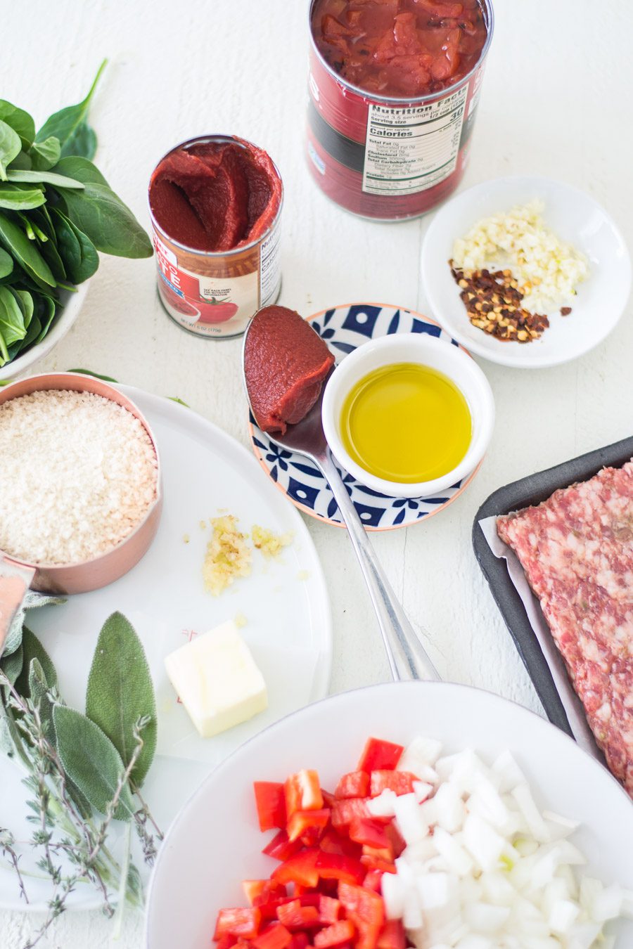 A rustic pasta dish made from ground Italian sausage, onion, bell pepper, canned fire-roasted tomatoes, tomato paste, and spinach. Top with crispy garlic breadcrumbs for another layer of texture and flavor.