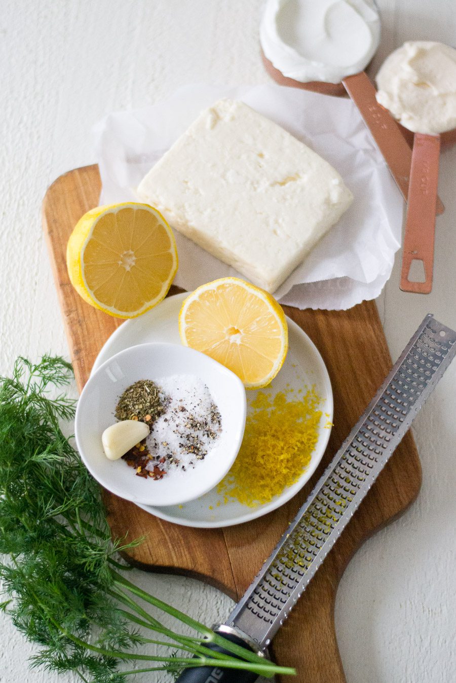 Easy whipped feta is made in the food processor with lemon, garlic, dill, oregano, mayo, and sour cream.