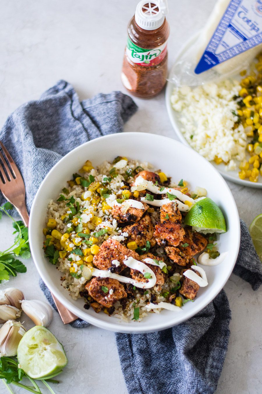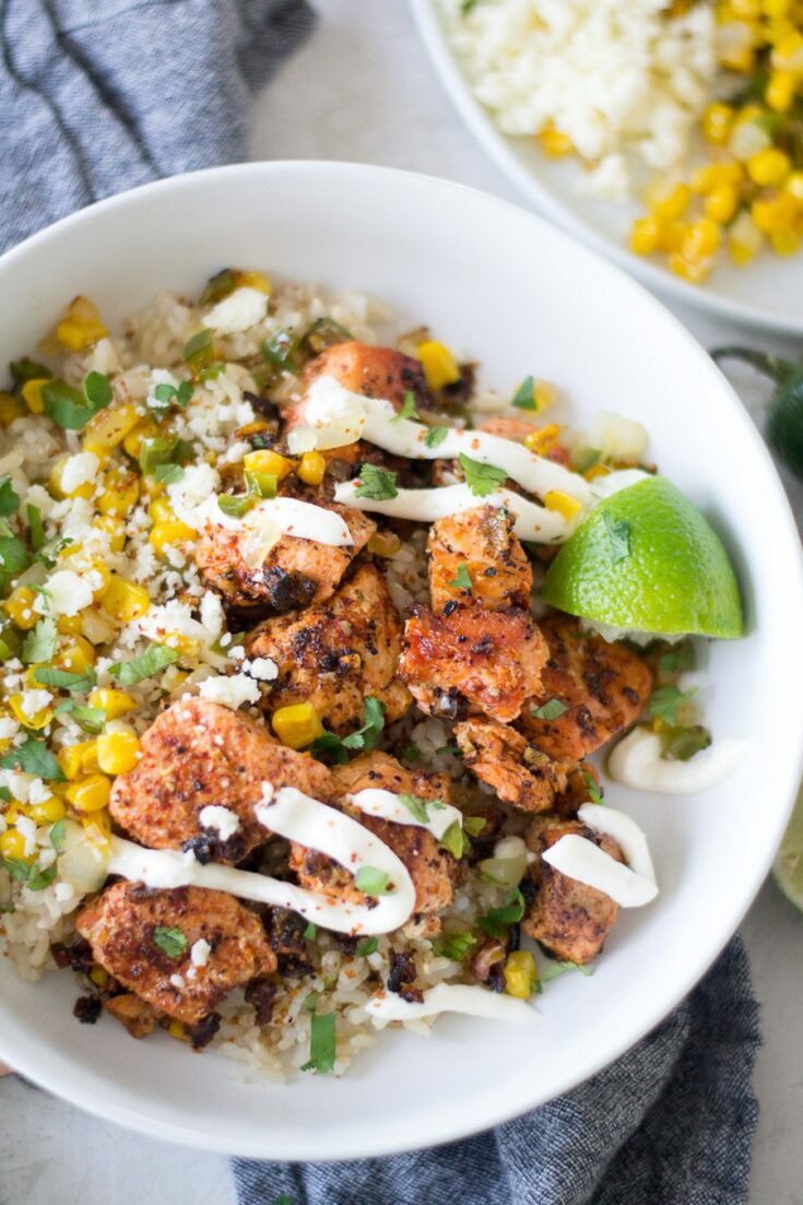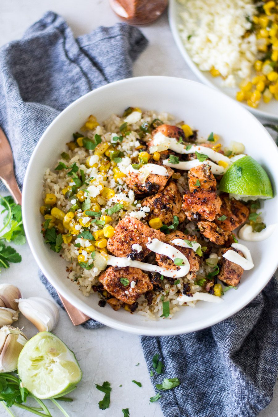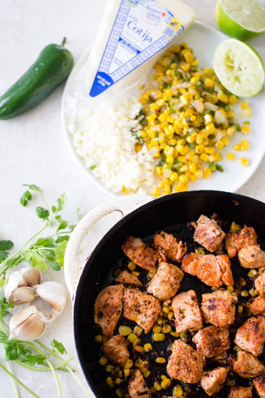 Skillet street corn salmon is like an elote burrito bowl with salmon.