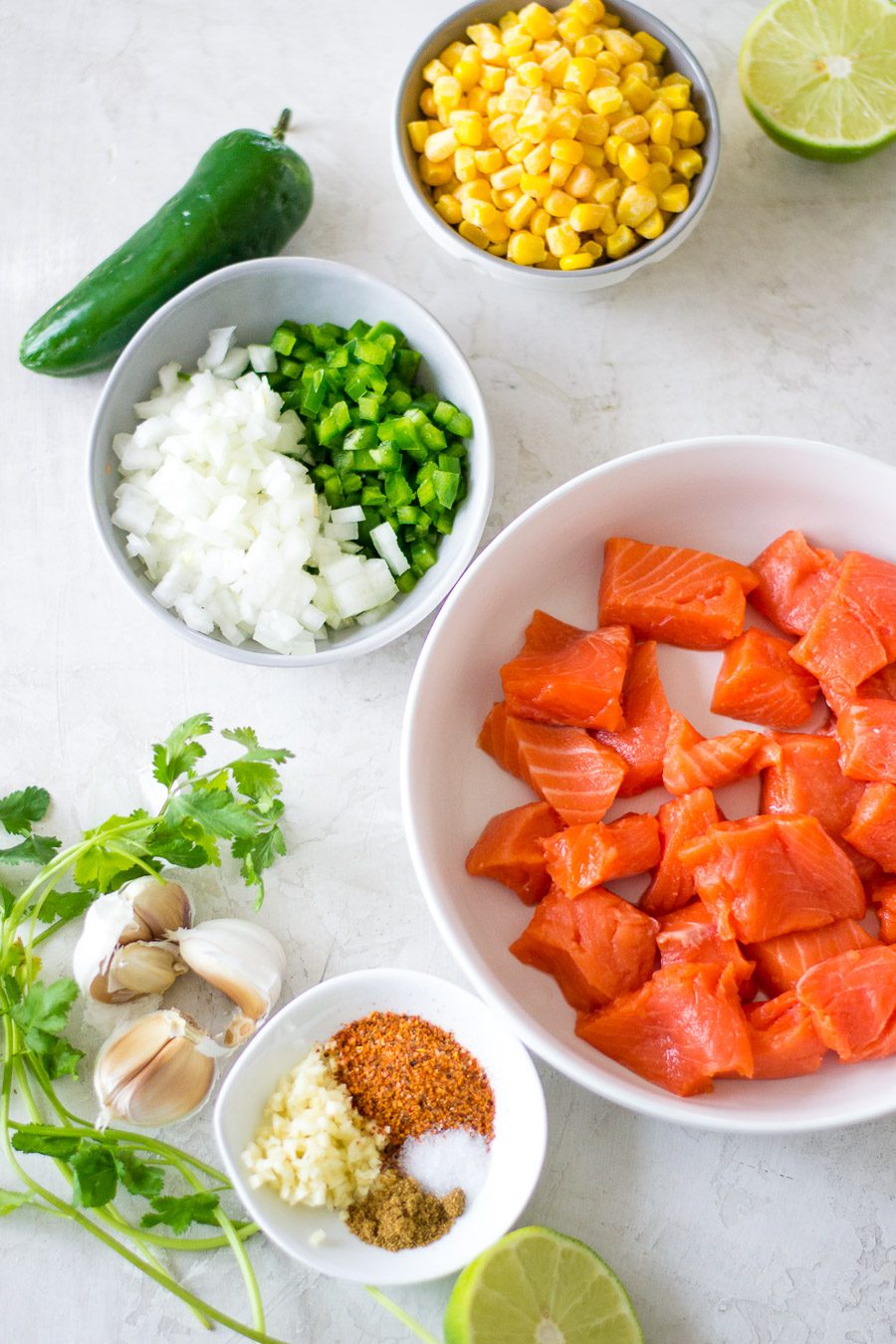 The thing that takes the longest is cutting the skin off the salmon and into cubes.