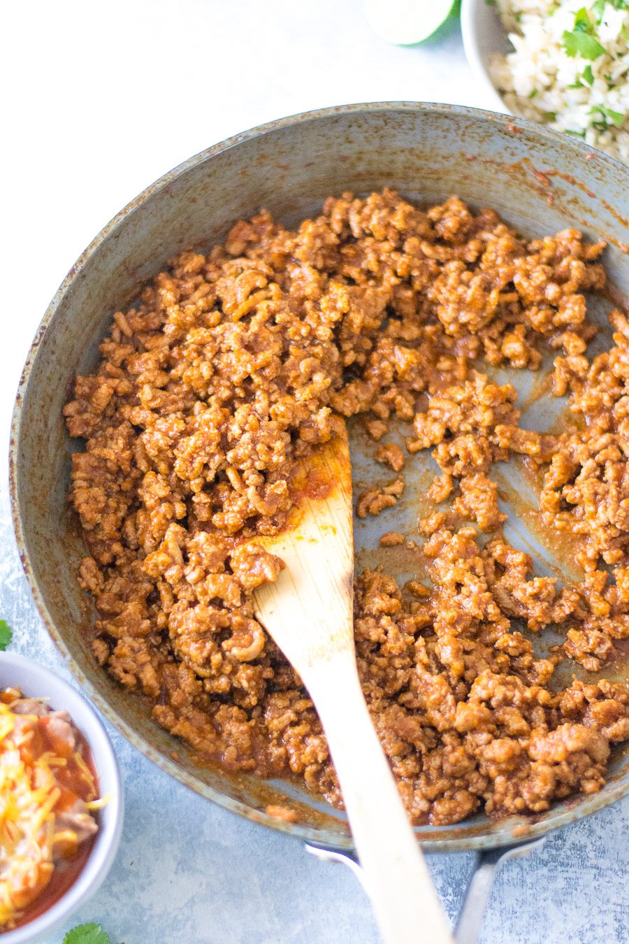 You can also make this recipe a true copycat and use ground beef instead. Ground soyrizo for a vegetarian or vegan twist would work as well, but you would need to reduce the cook time and the heat so not to burn.