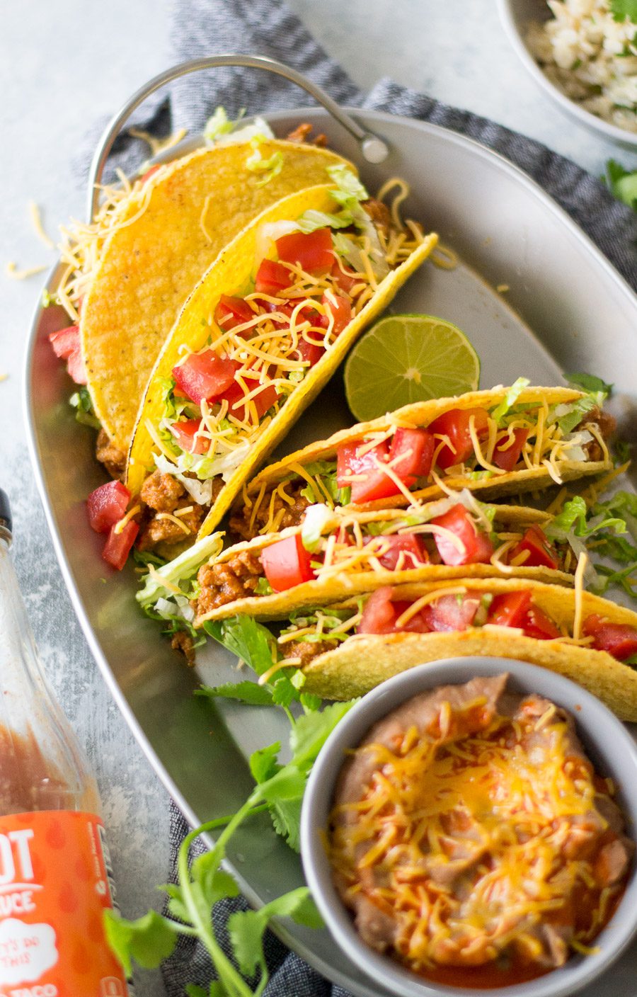 To keep these on brand with Taco Bell hard shell tacos, I recommend to serve them in a hard shell and top with: