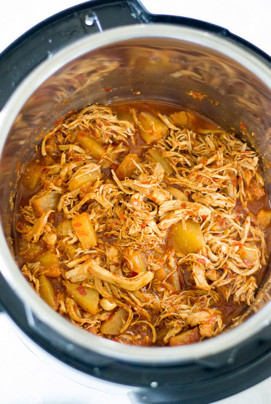 Shredded chicken cooked in the pressure cooker or slow cooker in a smoky, sweet, spicy chili and pineapple sauce.