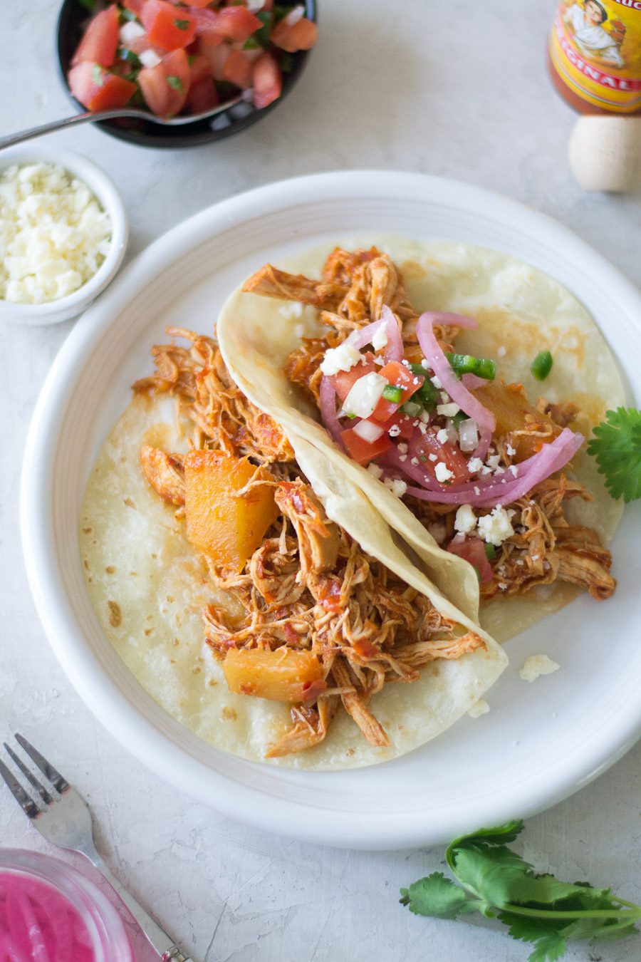 Naturally, once the Instant Pot chicken al pastor tacos meat are cooked, you’ll need some sort of vehicle for the meat.