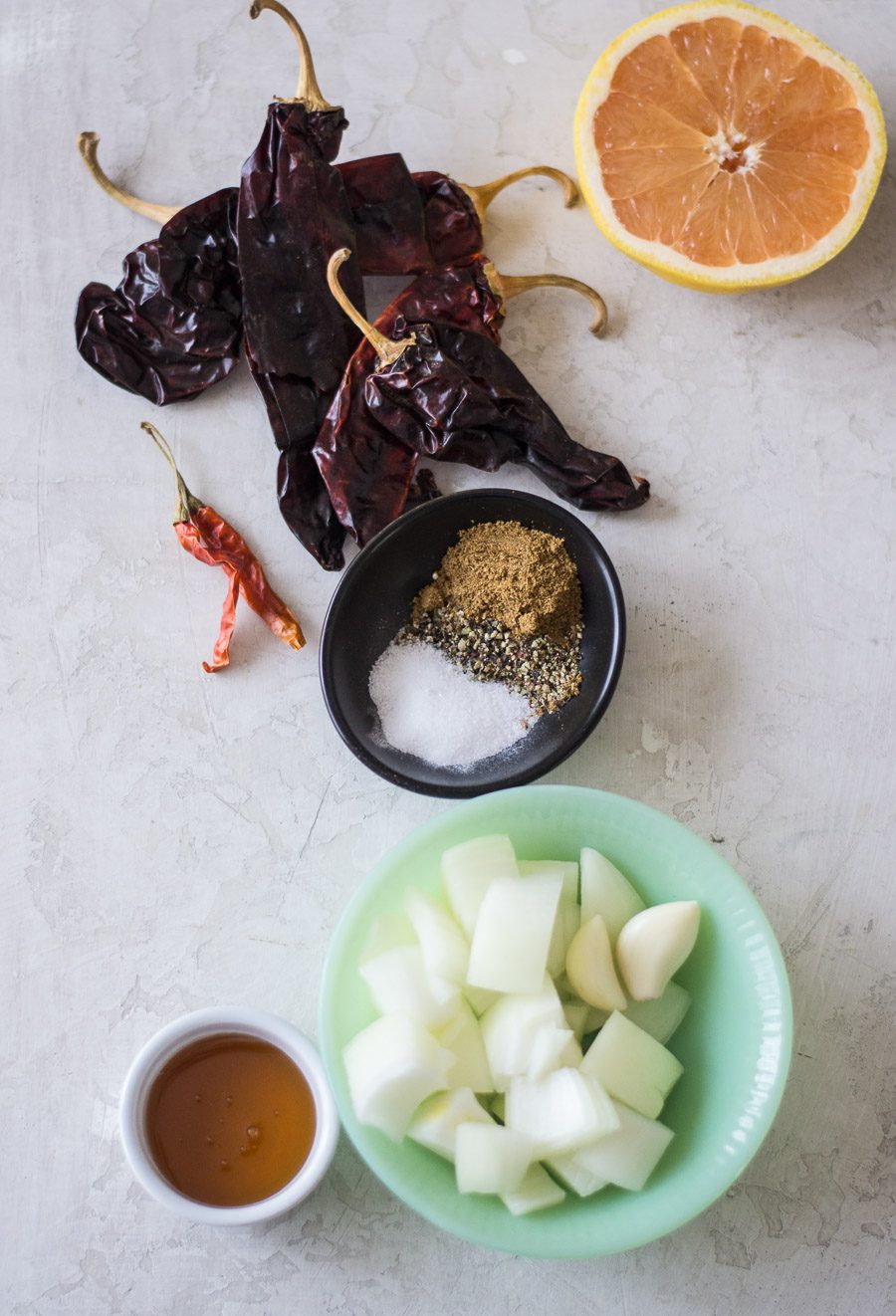 - When the chilies are tender and plump, transfer them along with 1 cup of the chili water to a food processor. Add the garlic, onion, cumin, salt, pepper, orange juice, and honey. Pulse until the sauce is pureed. Add a little more of the reserved chili water if needed.