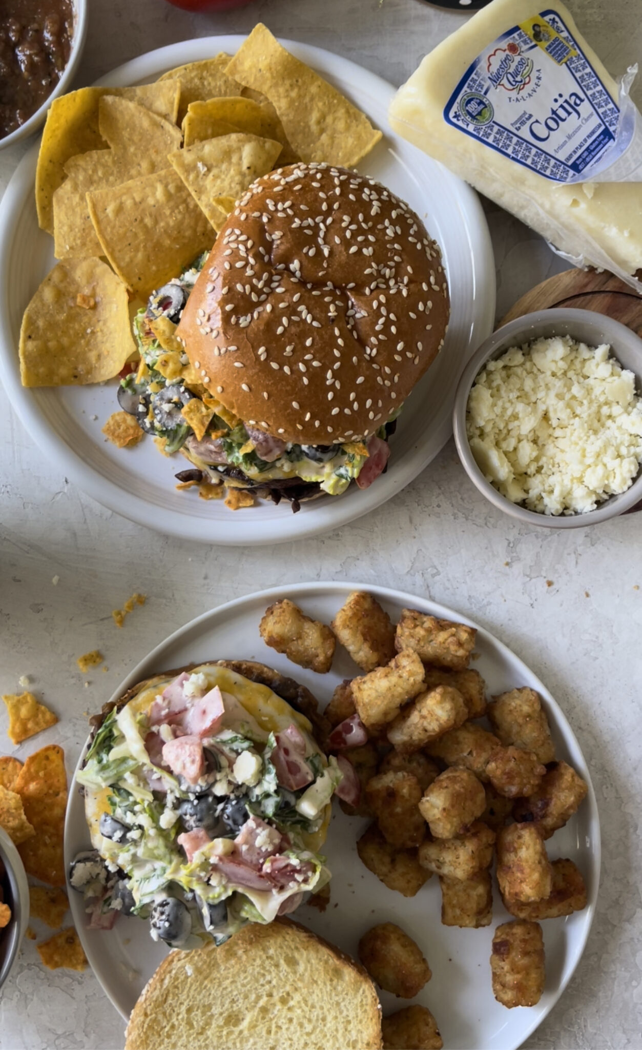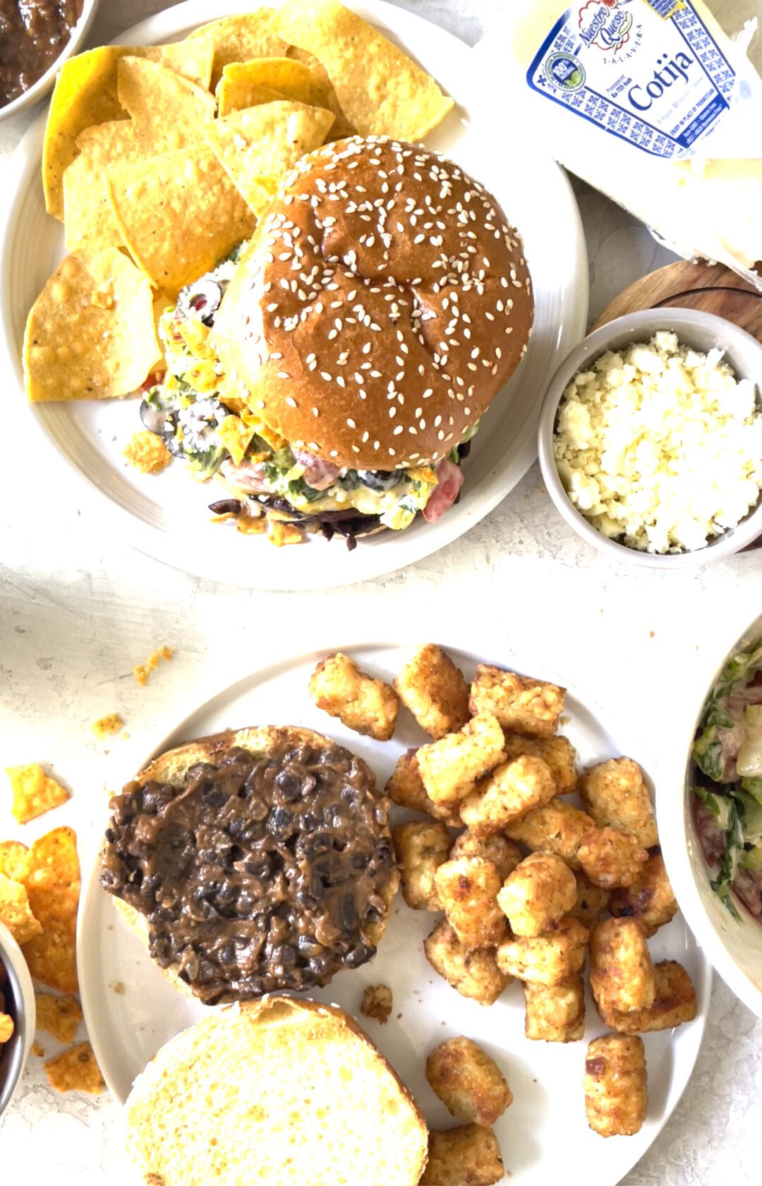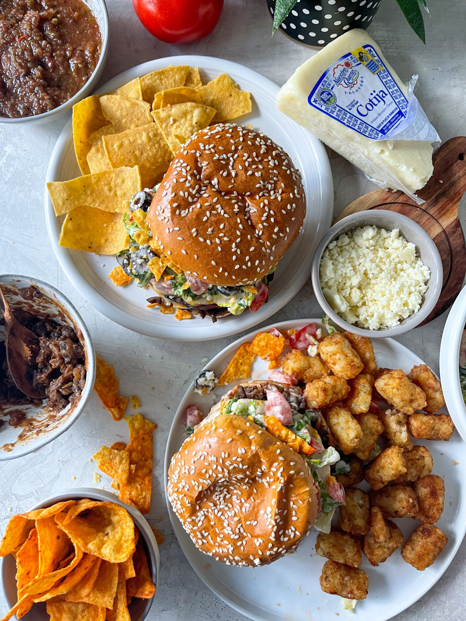 - Arrange the burgers. Add a few tablespoons of the bean mixture to each bottom bun. Add a burger patty to the bean layer. Use tongs to add a heaping amount of salad to each burger patty. Add a big pinch of the Doritos to each salad pile along with a pinch of the cheese. Place the top bun over the Doritos and salad. Serve.