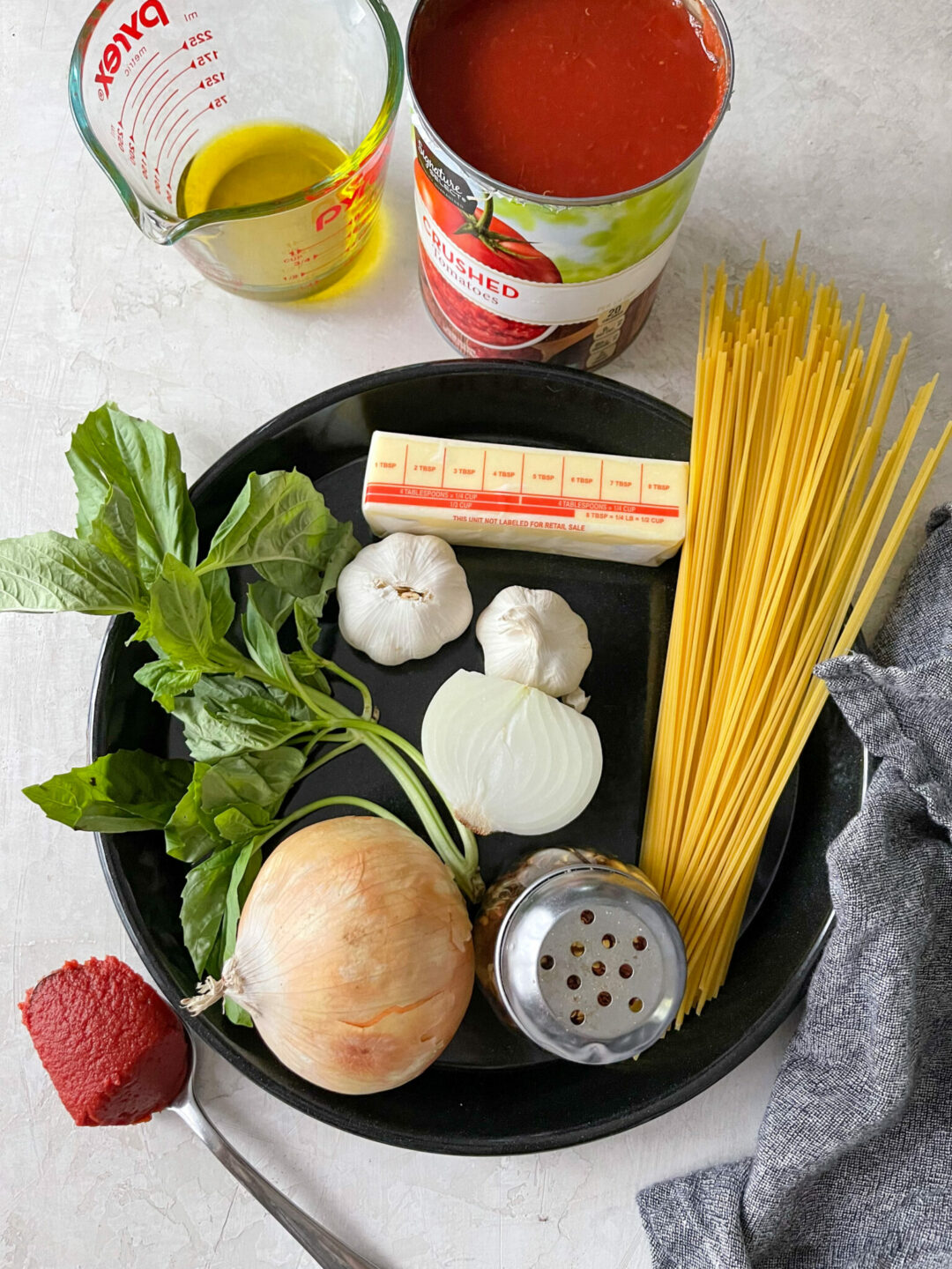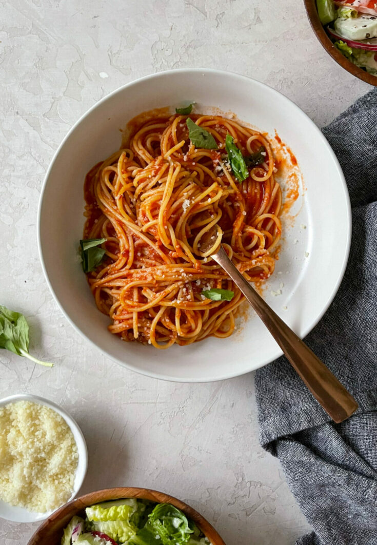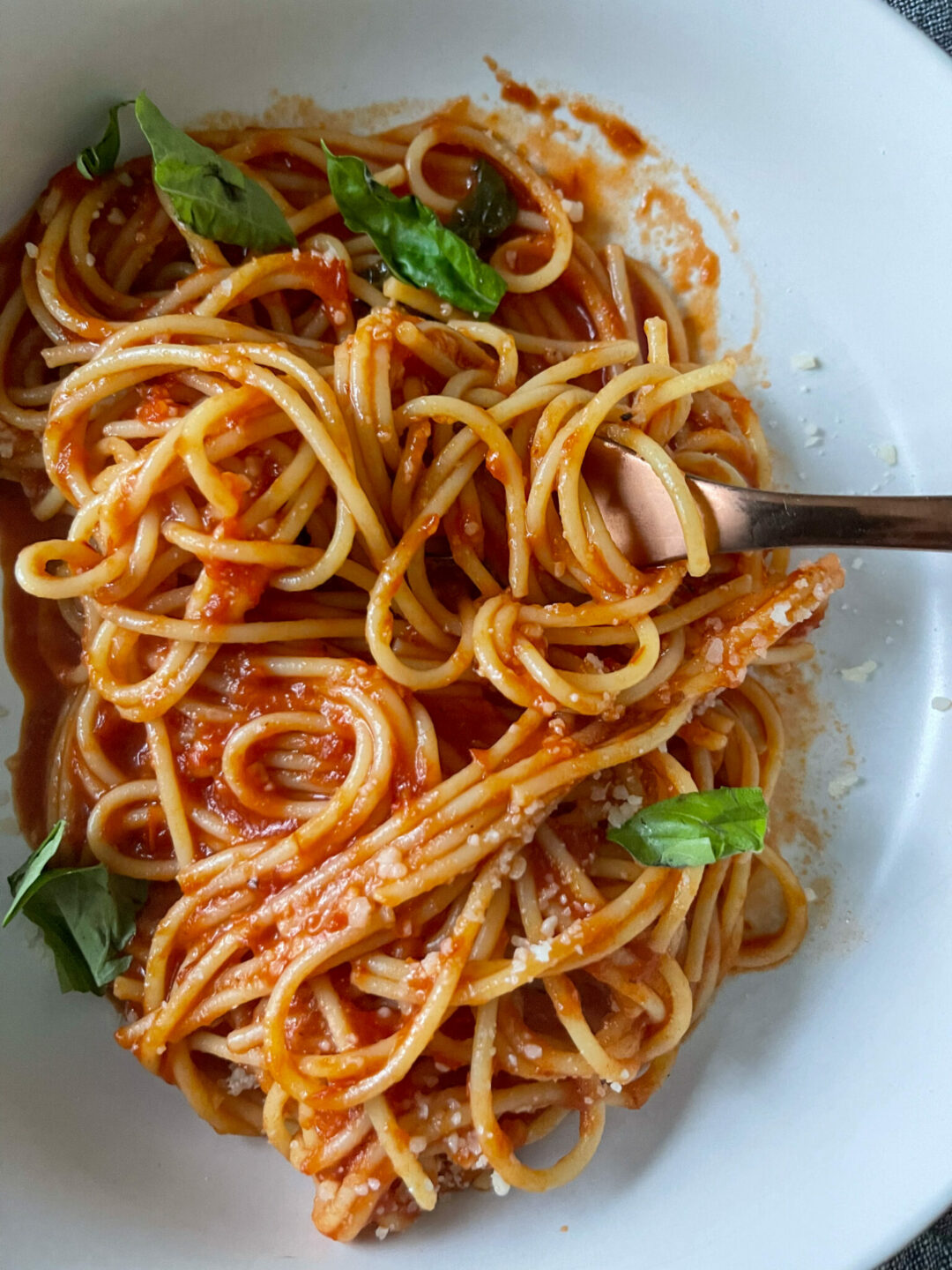 Classic spaghetti pomodoro from The Bear has become a family favorite. It takes canned crushed tomatoes, onion, butter, and olive oil and transforms it into a delicious, flavor-layered sauce perfect for spaghetti noodles. It just takes a little time.