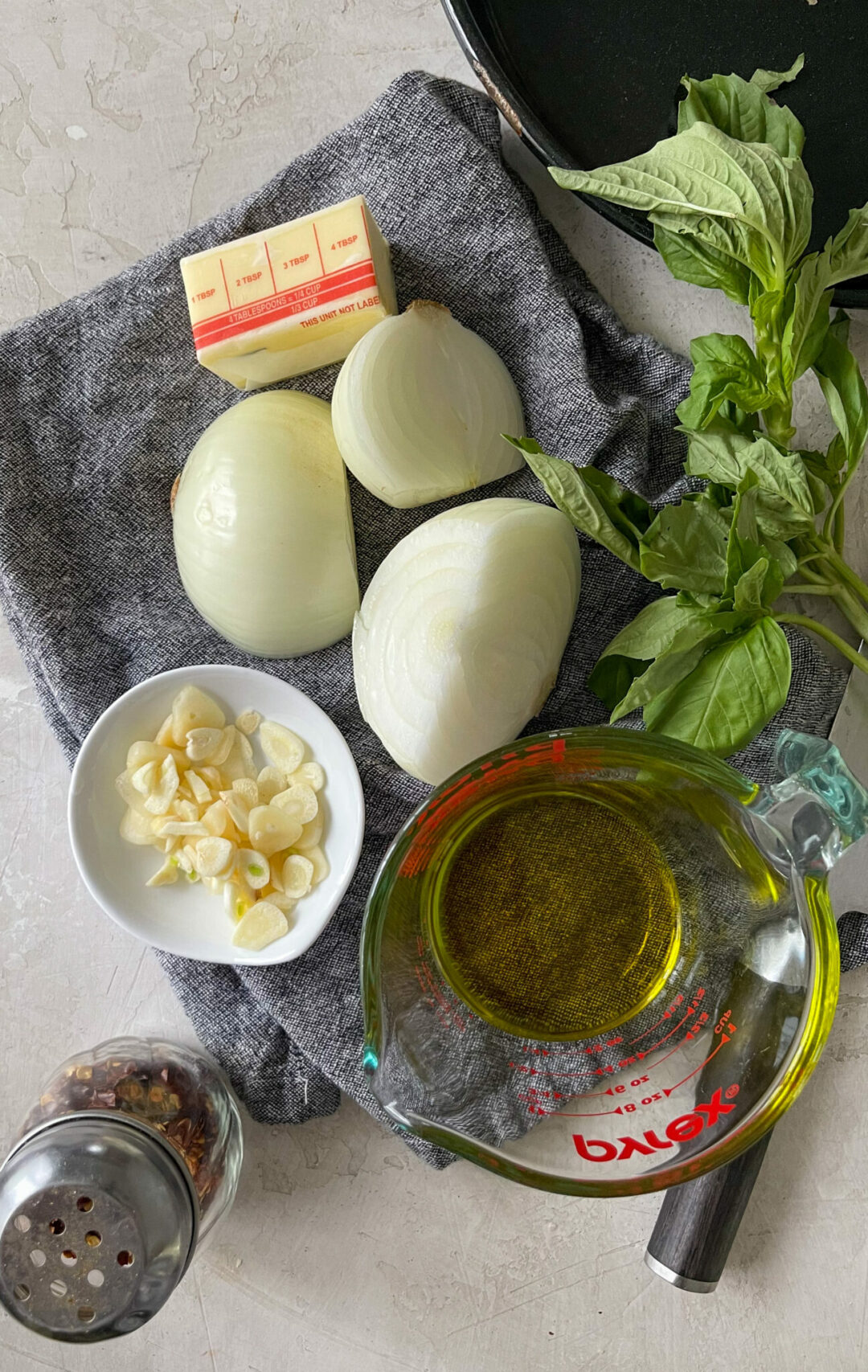 - Heat a Dutch oven or large stock pot over medium for a minute or two. Add olive oil. Heat through for a minute then add the crushed red pepper flakes. Add as much or as little as you can handle. Add a big pinch of salt. Stir to combine. After a minute, add the onions cut side down. Cook for about 5 minutes.