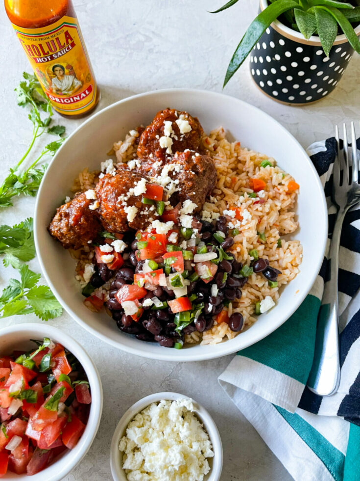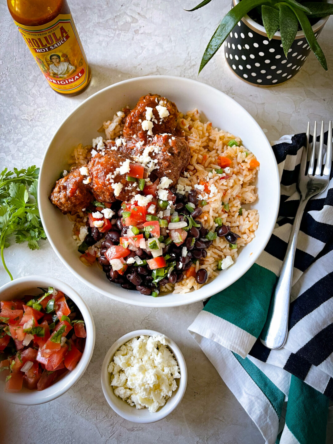 - Serve meatballs hot with a few spoonfuls of sauce on top over rice or with corn tortillas. Top with more queso fresco and chopped fresh cilantro.