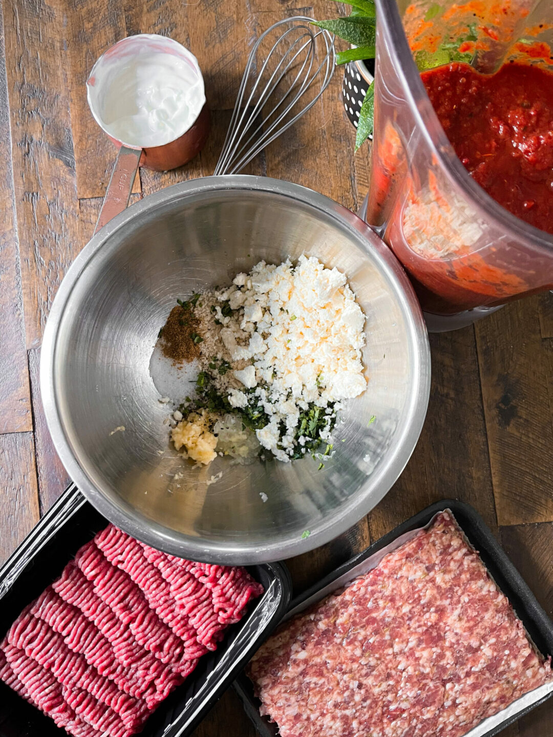 Mix the meatballs together by gently pulling the meat apart and folding in the ingredients.
